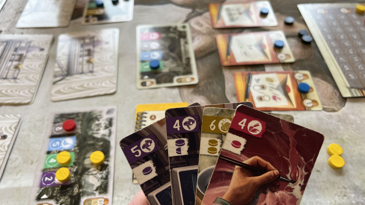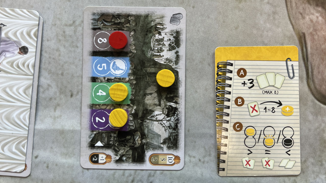 Neben dem Ressourcenmanagement (A und B) ist die Schlüsselkomponente das Platzieren unseres Materials auf den Fresken (C). Man kann zuviel oder zuwenig oder die genaue Anzahl an Ressourcen einsetzen und erhält unterschiedliche Boni/Mali. Hier muss man die Anleitung loben, die dies genau und mit vielen Beispielen erläutert.