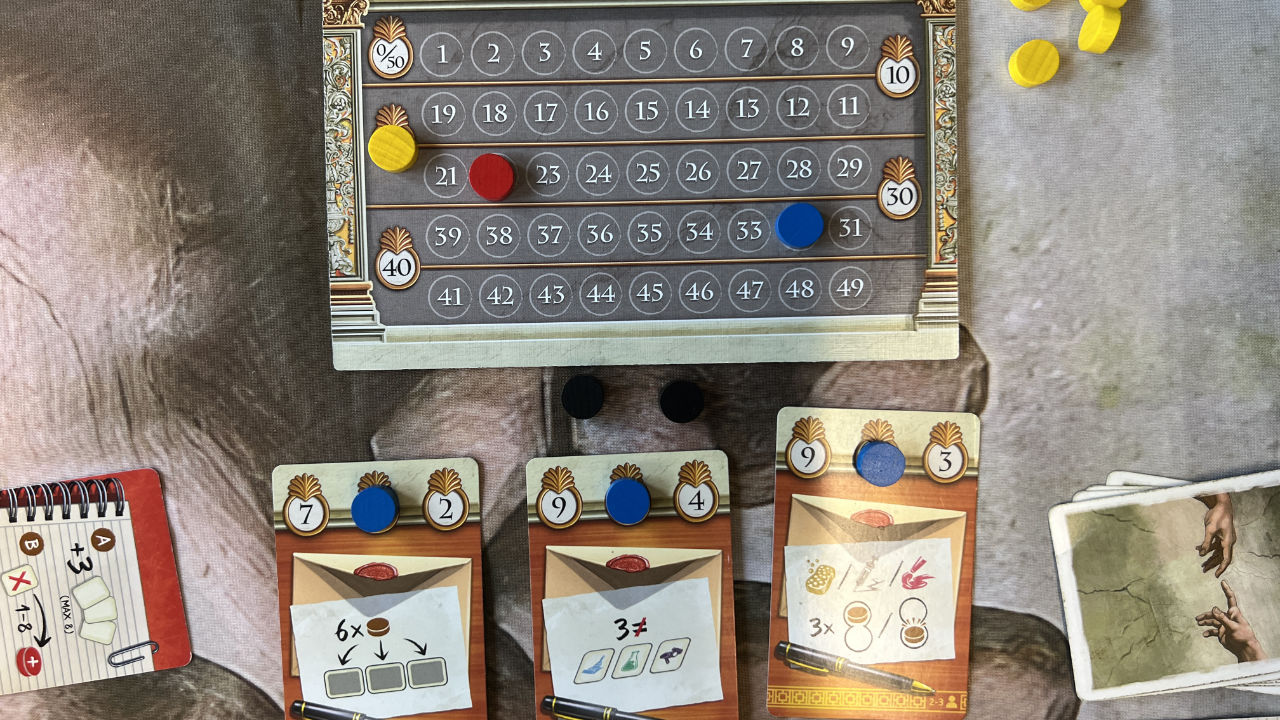 Um eine Fresko zu restaurieren, müssen alle Bereiche auf der entsprechende Karte erfüllt werden. Nach Abschluss wird das Fresko gewertet und die Spieler gehen auf der Siegpunkteleiste voran.