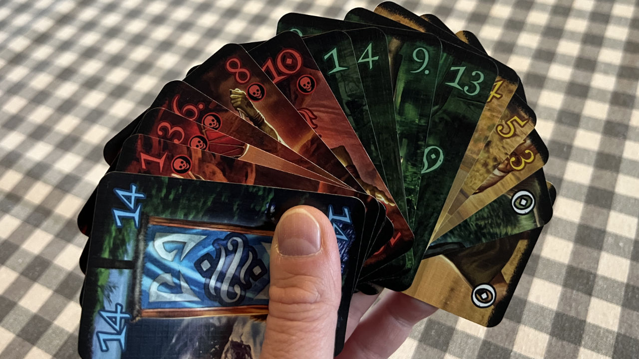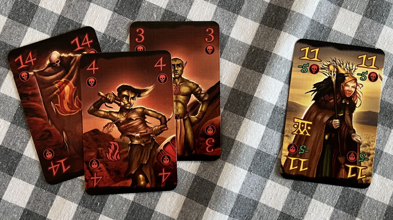 Im Unterschied zu Wizard, wo wir die Anzahl Stiche vorhersagen sollen, wollen wir hier möglichst keine Stiche mit Feuerpunkten bekommen. Nachdem alle Karten verteilt und noch ein paar Karten untereinander getauscht wurden, folgt ein normales Stichspiel. Man muss bedienen, es gibt keinen Trumpf. Ausnahme bildet der Zauberer. Diesen kann man anstelle zu Bedienen spielen, funktioniert also wie der Narr in Wizard.