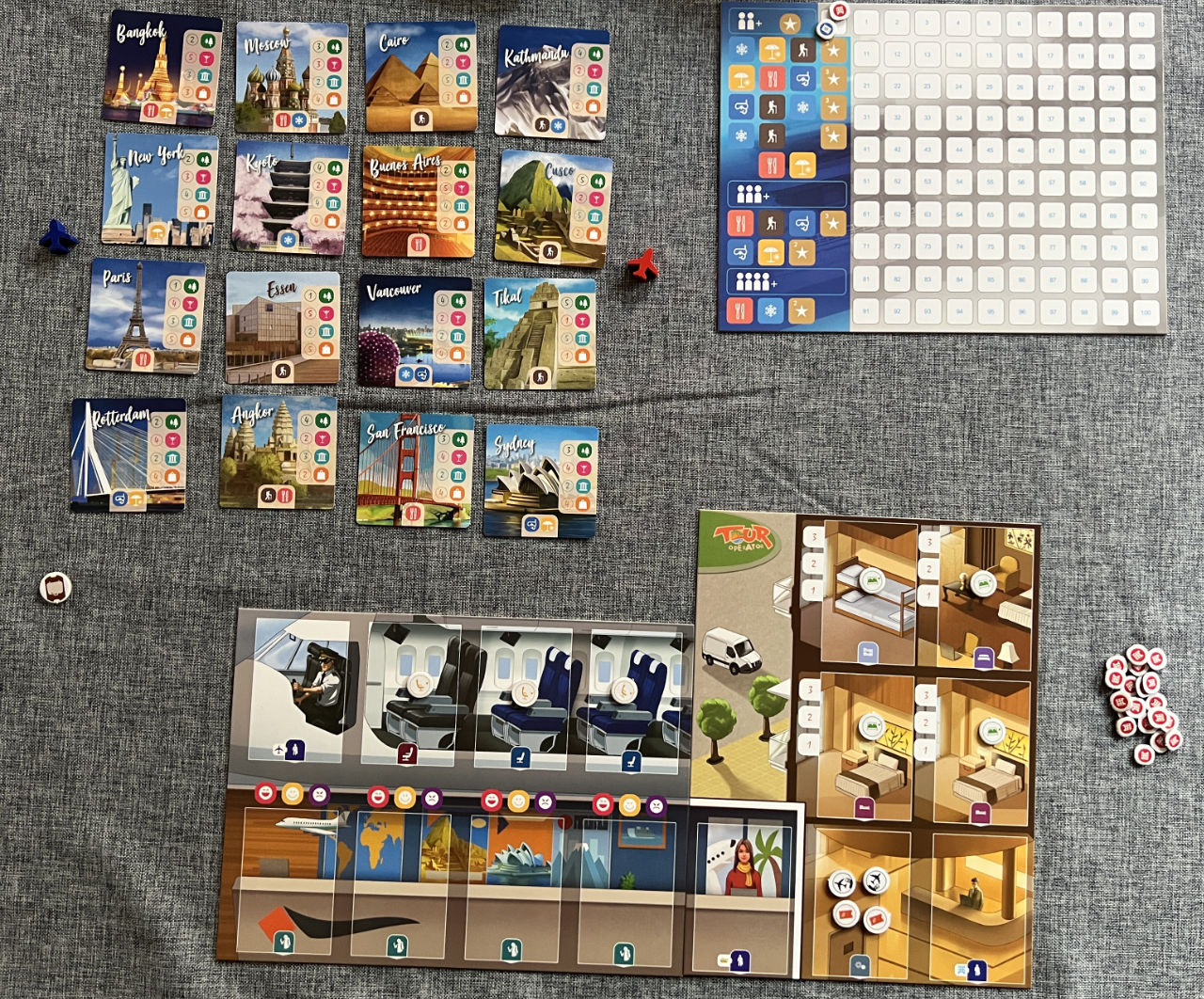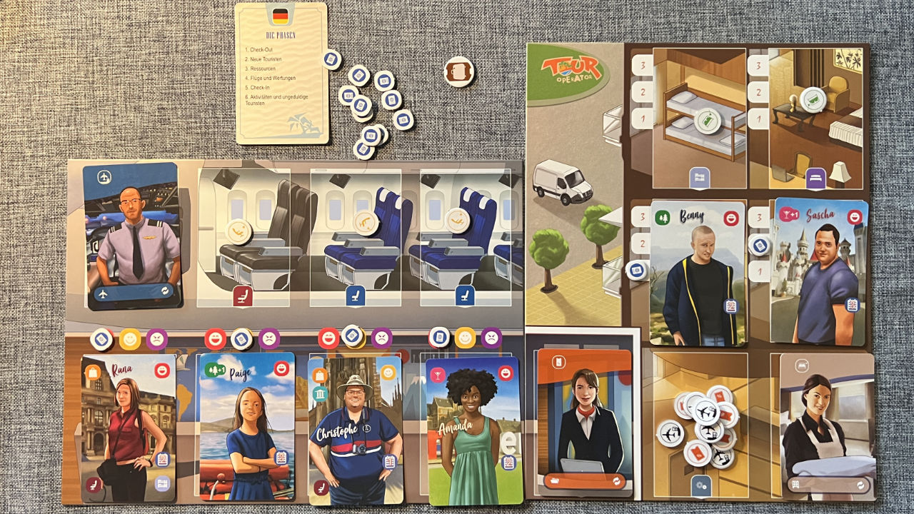 Als Leiter eines Reisebüros kümmere ich mich um Touristen, denen ich Plätze im Flugzeug organisiere, zu wunderschönen Orten fliege und dort in tolle saubere Zimmer einbuche. Eine Runde läuft über sechs Phasen, die die Spieler überwiegend zeitgleich durchführen können. In der Flugphase muss man die Reihenfolge dann schon einhalten, da jeder Ort nur von einer Person besucht werden kann und somit hier ein Wettlauf um die besten Orte stattfindet. Eine Haupttätigkeit besteht darin, die Plätze im Flugzeug und Hotel immer zu säubern. Hierfür muss man in der Ressourcen-Phase gut würfeln, oder man hat Mitarbeiter im Team, die gut putzen können.