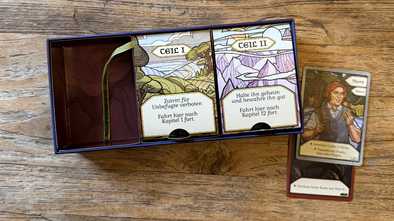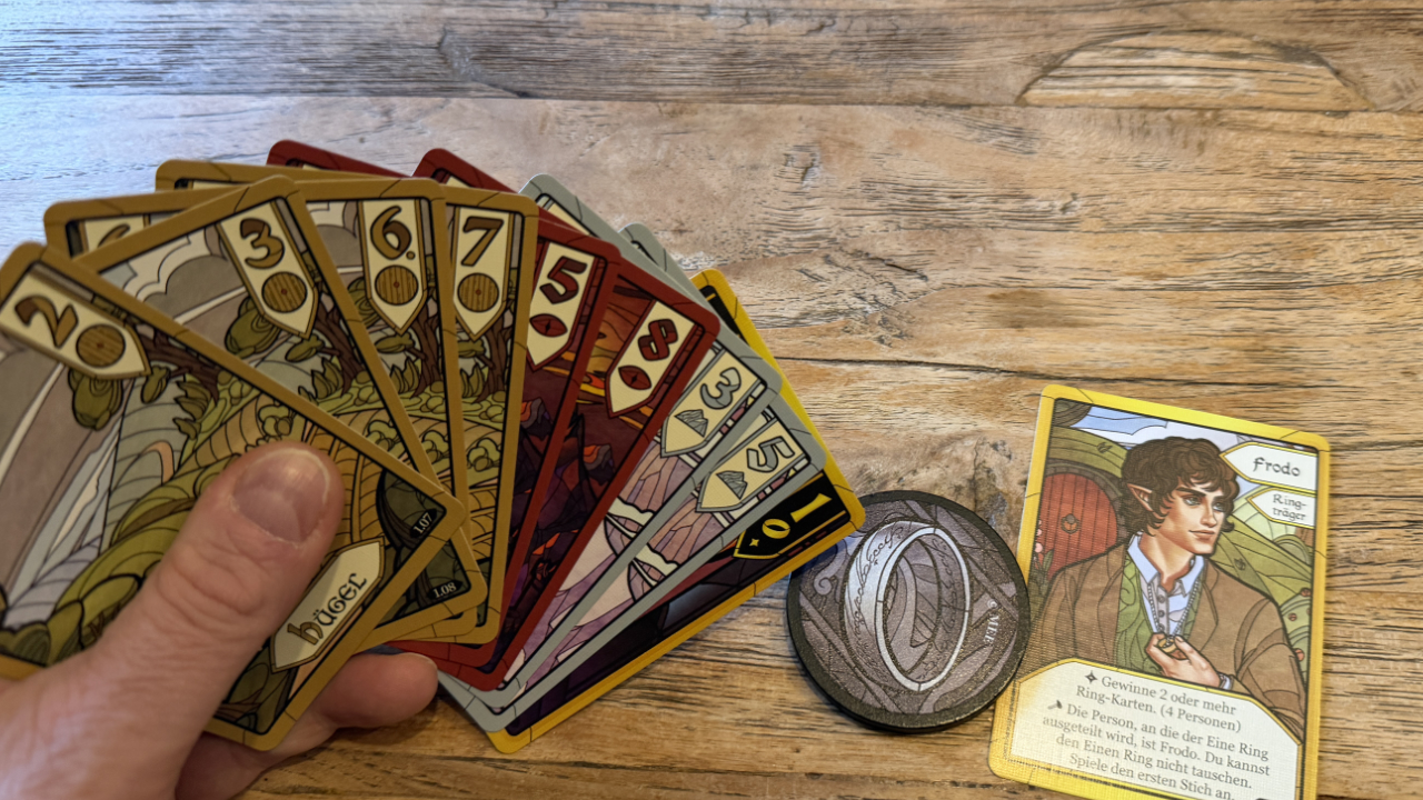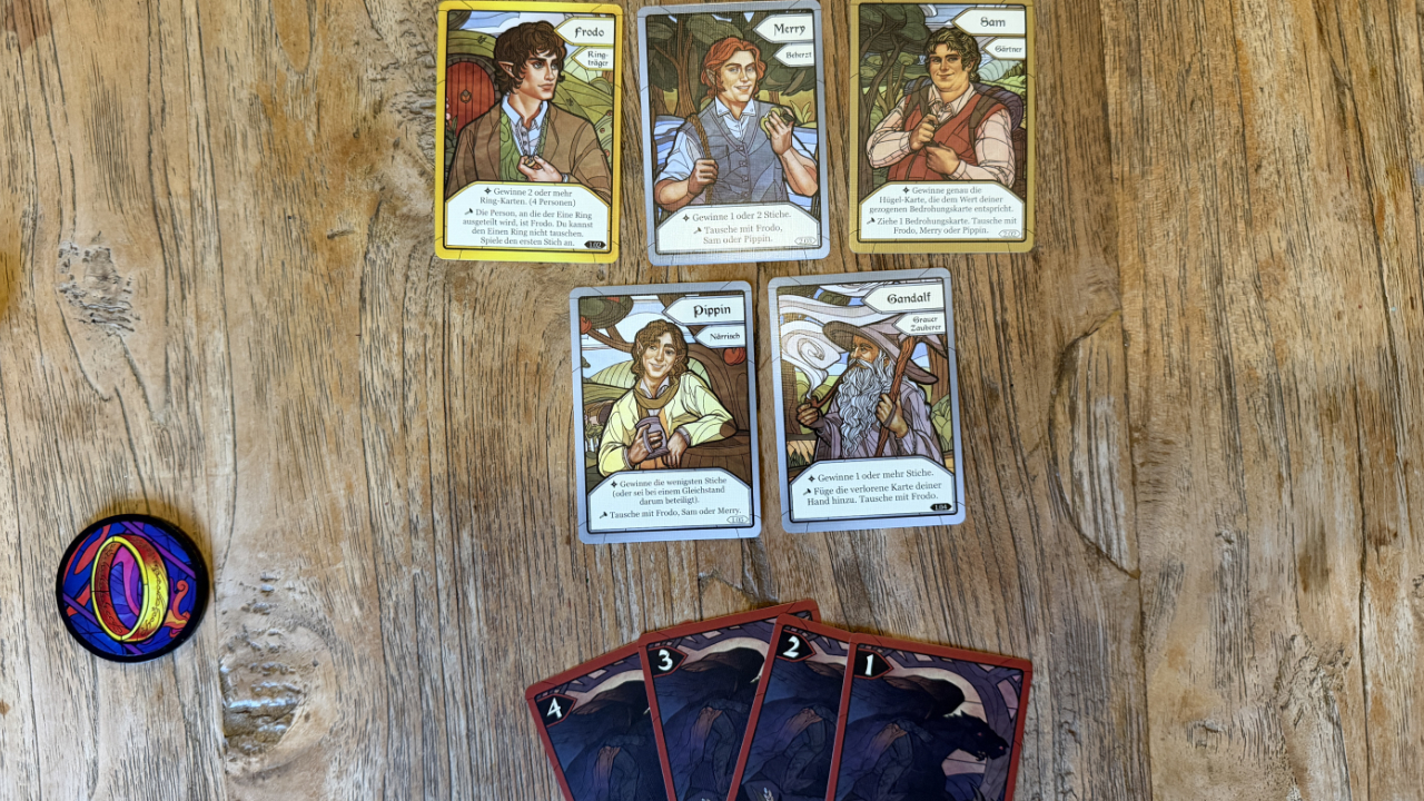 Seit The Crew nicht neu ist dieses auch ein kooperatives Stichspiel mit sich kapitelweise ändernden Regeln. Als Grundkonzept haben wir vier Kartensets in vier Farben und den Werten 1 bis 8 sowie 5 Ringkarten. Nachdem die Spieler sich ihre Karten angesehen haben, wählen sie aus verschiedenen Charakteren aus der Tolkien-Welt je eine aus und haben somit spezielle Siegbedingungen. Im Laufe der Kapitel kommen immer weitere Charaktere hinzu und es wird deutlich komplexer. So möchte man als Pippin am wenigsten Stiche bekommen und Frodo muss mindestens zwei Ringe sammeln. Nun müssen kooperativ alle ihre Siegbedingung erfüllen, damit wir zum nächsten Kapitel voranschreiten.