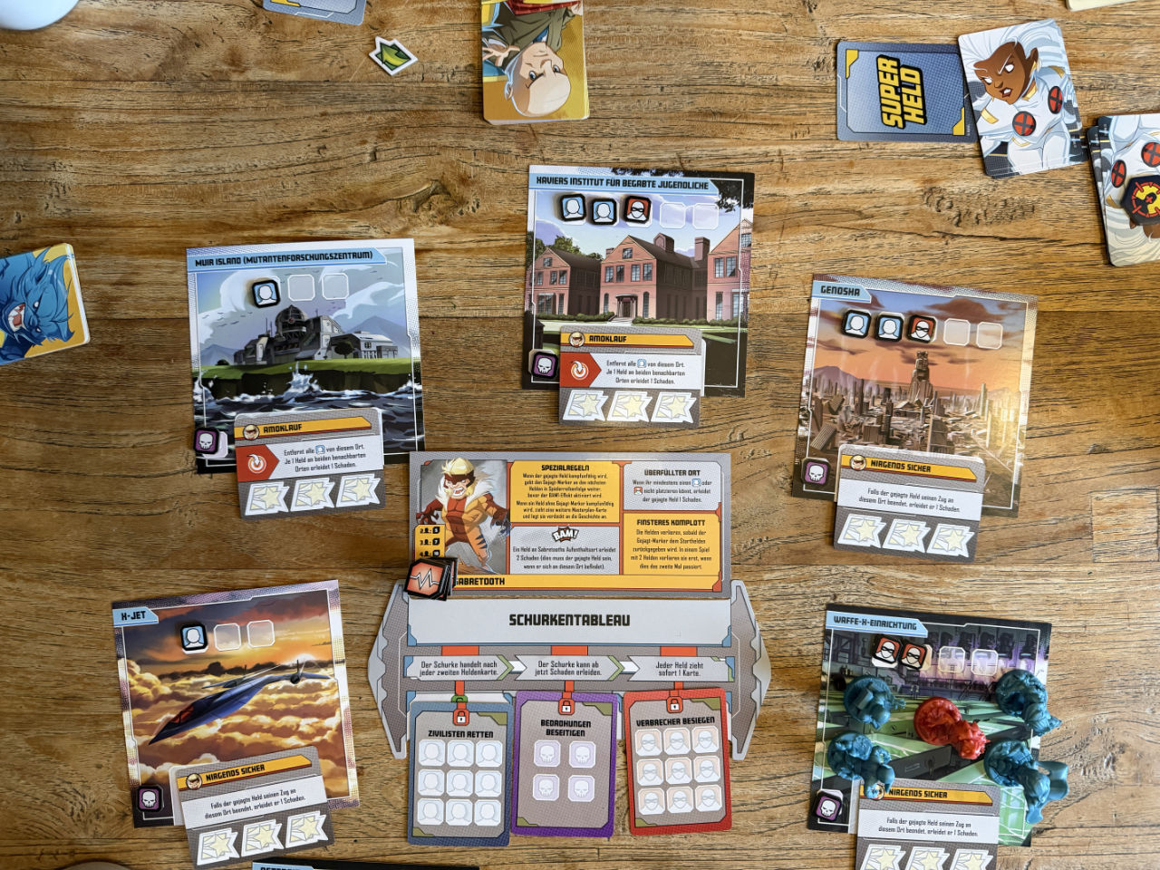 Der Aufbau geht schnell. Wir Helden spielen gegen den Bösewicht Sabretooth. Das Tableau in der Mitte zeigt seine Sonderregeln und unsere Aufgaben. Um ihn herum sind im Kreis die Orte mit den roten Schurken, blauen Unschuldigen und den Bedrohungen.