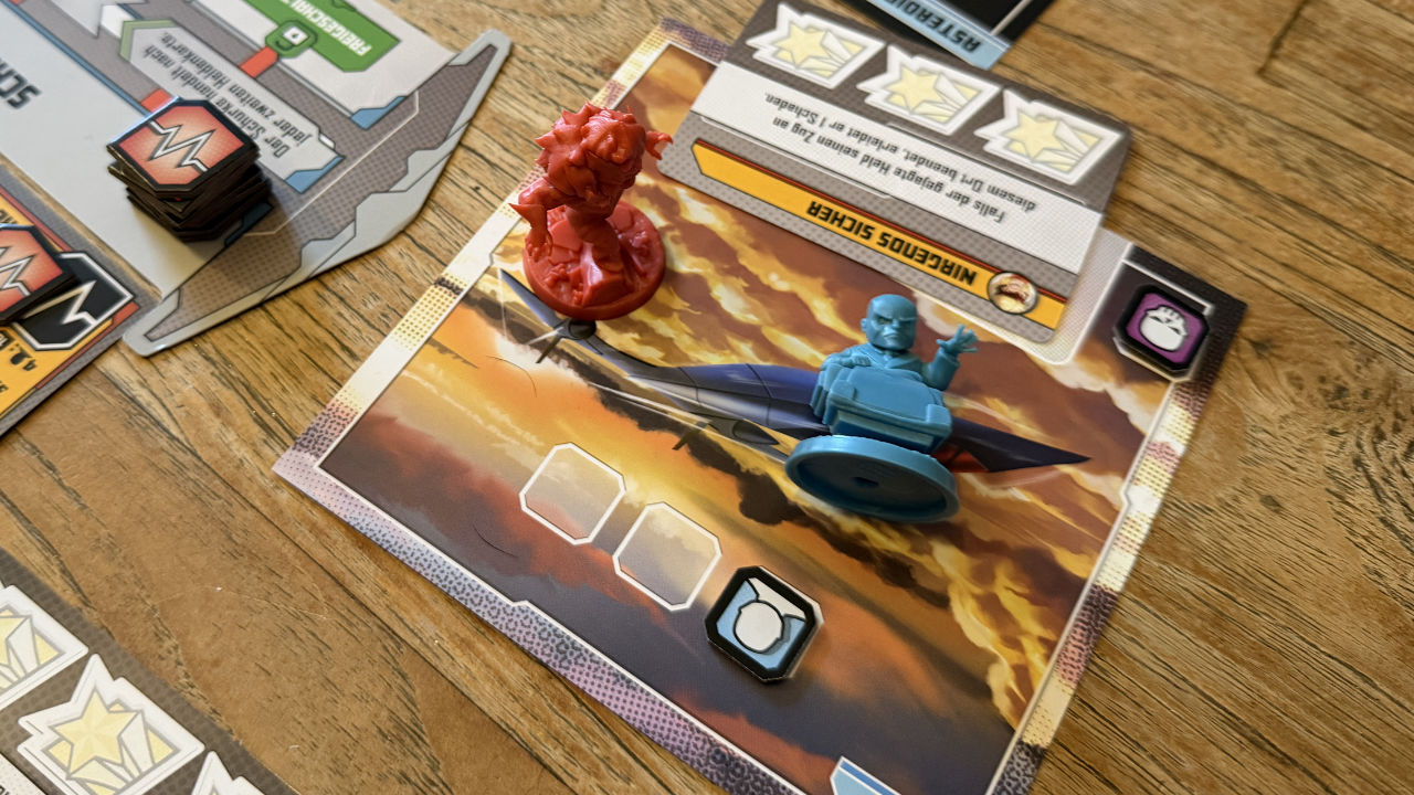 Mechanistisch haben wir ein Kartendeck und können hiermit zu Orten reisen, kämpfen, Schurken einbuchten, Bedrohungen beseitigen und Unschuldige beschützen. Unsere gespielten Karten bilden den Zeitstrahl. Den bösen Gegner dürfen wir erst angreifen, nachdem zwei von drei Missionen erfüllt wurden. Unsere wenigen Handkarten nutzen wir für Aktionen, als Clou können wir auch eine Aktion des vorherigen Helden mitbenutzen, dies hat mir als Idee gut gefallen und erhöht die Strategiekomponente. Weiterhin sind die Handkarten unsere Lebenspunkte. Sind die auf Null ist man betäubt. Aber man zieht in der nächsten Runde vier neue Karten und der Anführermarker wandert ein Spieler weiter. Ist der Marker einmal im Kreis wieder beim Startspieler, hat der Schurke gewonnen. Auch clever durchdacht. Anfangs kommt der Schurke jeden dritten Zug ans Spiel und verteilt Schaden oder bringt neue Schurken ins Spiel. Nachdem wir die erste Mission erfüllt haben wird er wütender und kommt nach zwei Zügen der Helden wieder dran. Das alles ist erstaunlich gut balanciert.