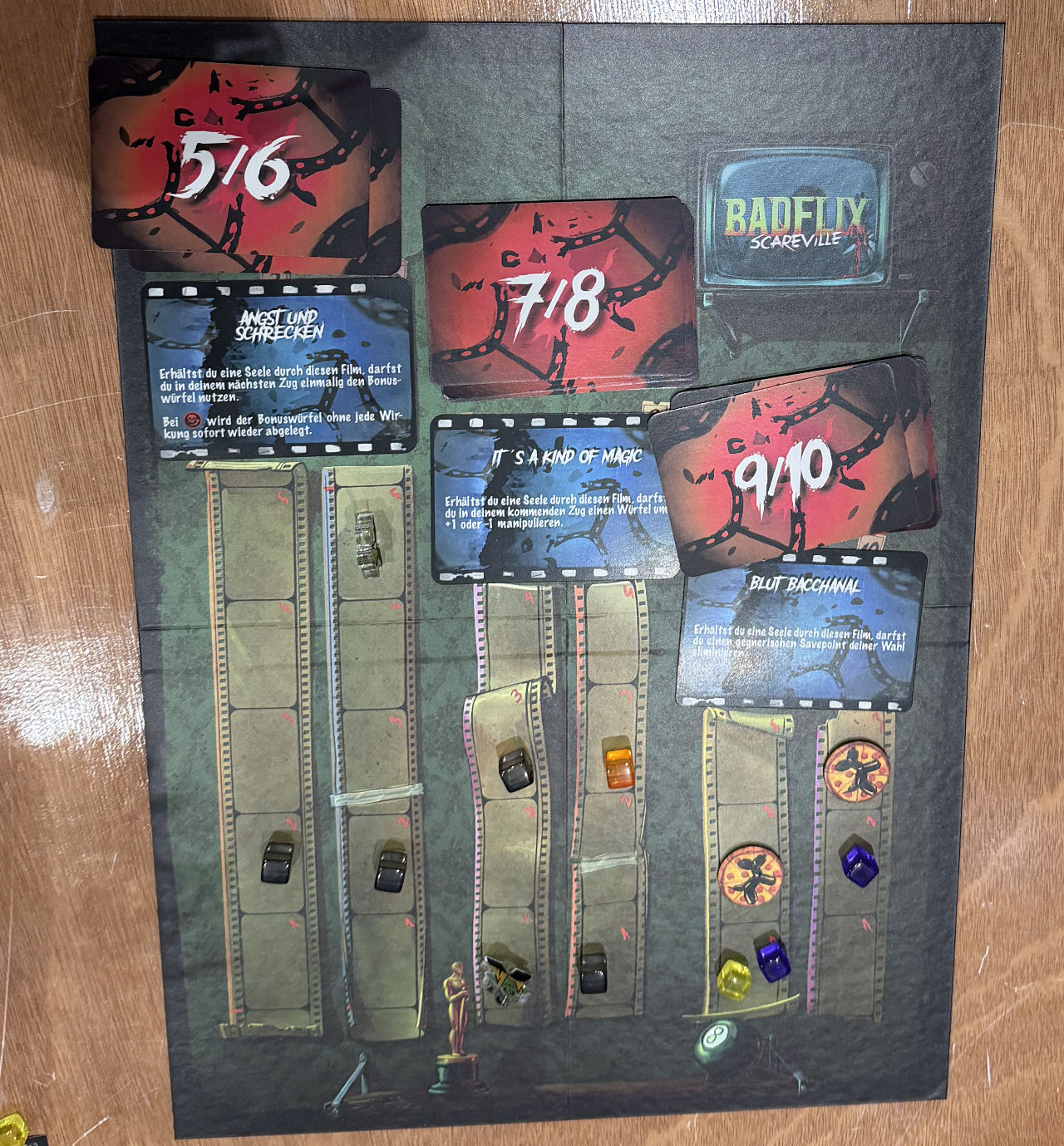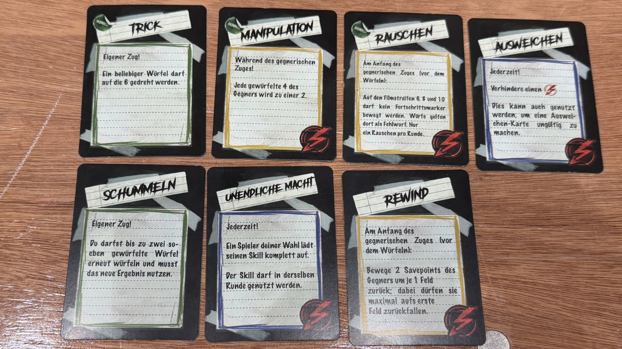 Je Runde gibt es noch Einschränkungen: Wir können nur auf zwei Filmrollen (also Zahlen zwischen 5 und 10) unseren Fortschritt verbessern. Außerdem können wir mit Karten einmalig andere Spieler ärgern oder bei sich selber Würfelergebnisse ändern. Ziel ist es, das Ende der Filmrolle zu erreichen, wobei der Weg bei den höheren Würfelergebnissen kürzer ist. Dann gibt es nicht nur einen weiteren Bonus, sondern auch eine Seele. Mit fünf Seelen hat man gewonnen.