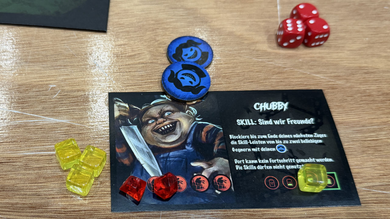 Chubby mit zwei roten Seelen. Die Sonderfähigkeit ist auf Stufe drei, bringt einen selber aber wenig. Leatherjacket kann als Sonderfähigkeit bis zu drei seiner Würfel um +/-1 manipulieren, das ist richtig stark.