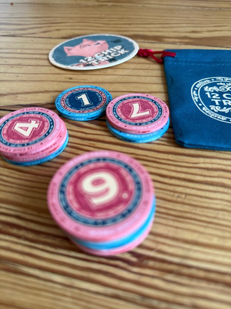 So bekamen wir das Spiel auf der Spielemesse Hamburg vorgestellt und durften direkt mit der Idealanzahl von drei Spielern unsere Stiche mit Chips machen. Dabei werden die Stiche mit einem Trick-Taking Mechanismus und Elementen von Blackjack verknüpft: als Spieler versuchen wir Chips mit einem Gesamtwert von maximal 21 Punkten zu sammeln, ohne diesen Wert zu überschreiten. Wenn jedoch alle Spieler über die 21 kommen, gewinnt derjenige mit den meisten Punkten die Runde. Weitere Varianten bringen dazu noch Abwechslung.