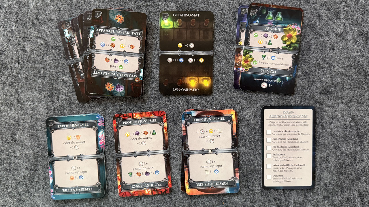 „Das Labor to go“ steht auf der Schachtel und hat mich sofort angesprochen. Wie schon im Vorgänger Palm Island ist hier etwas Fingerfertigkeit erforderlich, denn die Karten haben erneut vier Bereiche, je zwei auf der Vor- und Rückseite.