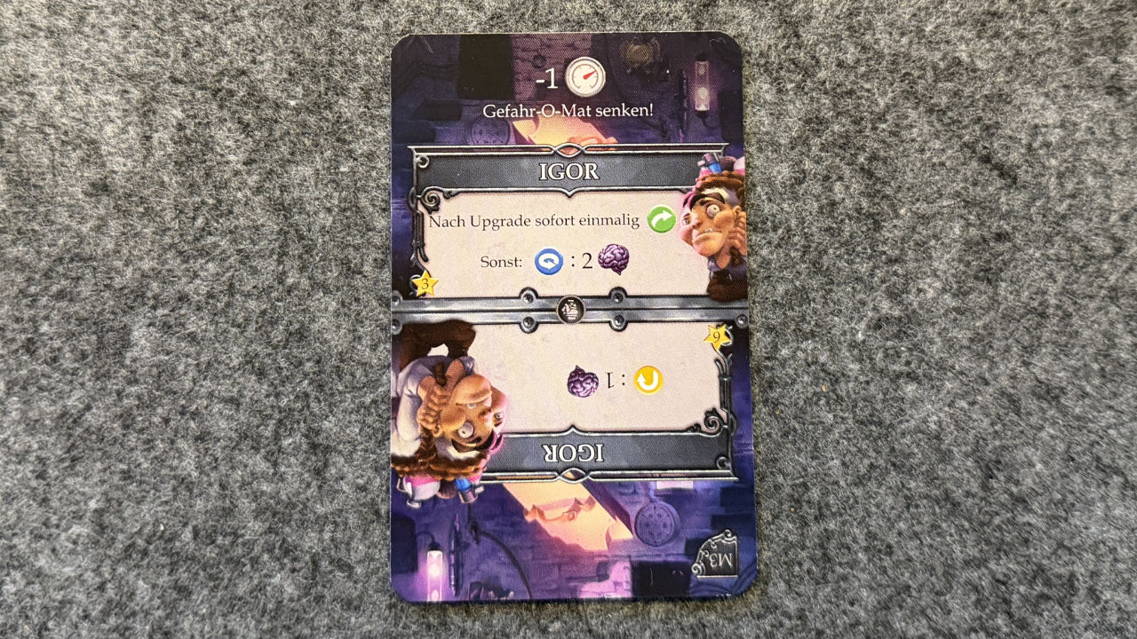 Neu sind die Minion- und Produktionskarten, die auch etwas komplizierter sind. So müssen diese ganz hinten im Kartendeck platziert werden und sie führen durch das Rundenende. Hier werden dann auch die abhängig von der Spielvariante Missionsfortschritte geprüft. Im Produktionsmodus muss ich in der ersten Phase je eine der drei Ressourcen haben, später sind es dann bis zu drei und wir haben die Siegbedingung erfüllt. Haben wir an diesem Schritt nicht die erforderlichen Ressourcen, dann steigt die Gefahr-O-Mat-Stufe an und nach Stufe vier haben wir verloren. Es gibt aber auch Möglichkeiten, die Stufen wieder zu reduzieren.