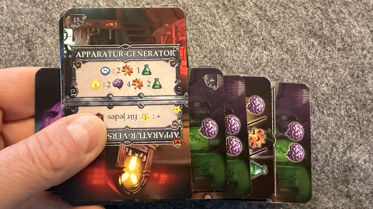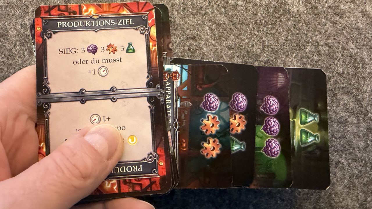 Bei anderen Missionen kommen weitere Ressourcen ins Spiel, die aber durch die Grundressourcen Gehirn, Zahnrad und Trank gewandelt werden. Durch Drehen und Wenden der Karten werden diese besser oder bringen Siegpunkte ein. Mit diesen kann man dann Errungenschaften freischalten oder einfach seinen Rekord notieren.