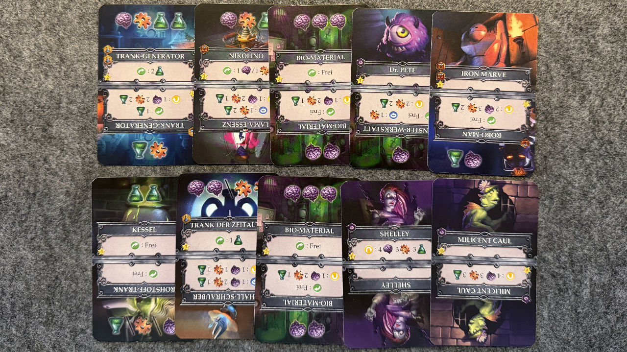 Und fühlen wir uns wie im Labor? Die Ressourcen Gehirn, Zahnrad und Trank sind wenig Chemielabor-spezifisch. Und auch wenn komische Kreaturen vorkommen sehe ich nicht Frankensteins Labor. In der Variante zu zweit spielen wir koop. Dies bedeutet aber, dass wir solo spielen und aber in der Endphase vor dem Gefahr-O-Mat unsere Ressourcen gemeinsam nutzen können. Im Vergleich zu Palm Island dauert ein Spiel deutlich länger. Wir verlieren also nicht so schnell und können etwas ruhiger erst unser Deck optimieren. Palm Island hat mir insgesamt besser gefallen, da man dort weitere Karten freischaltet und einen höheren Wiederspielwert hat.