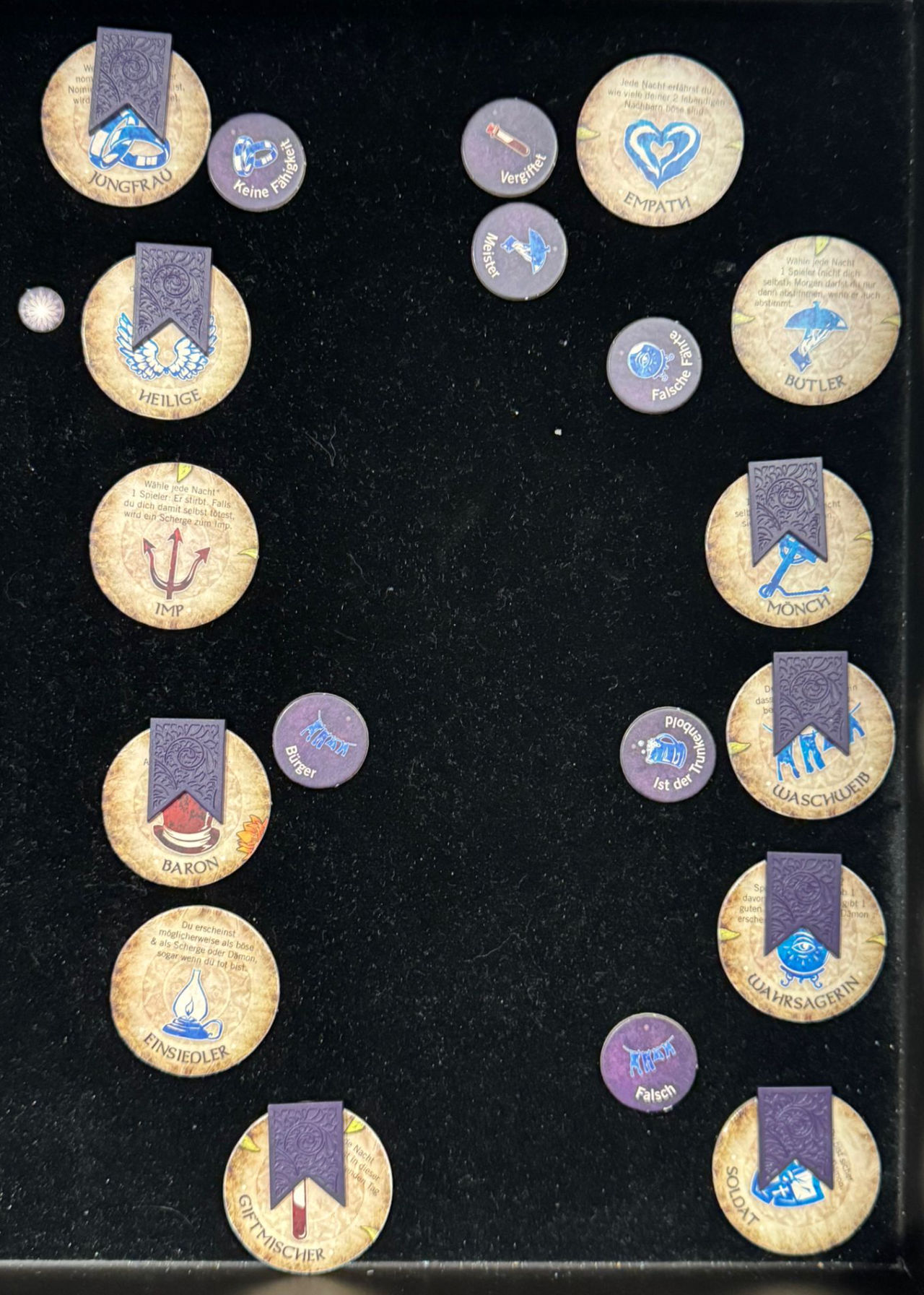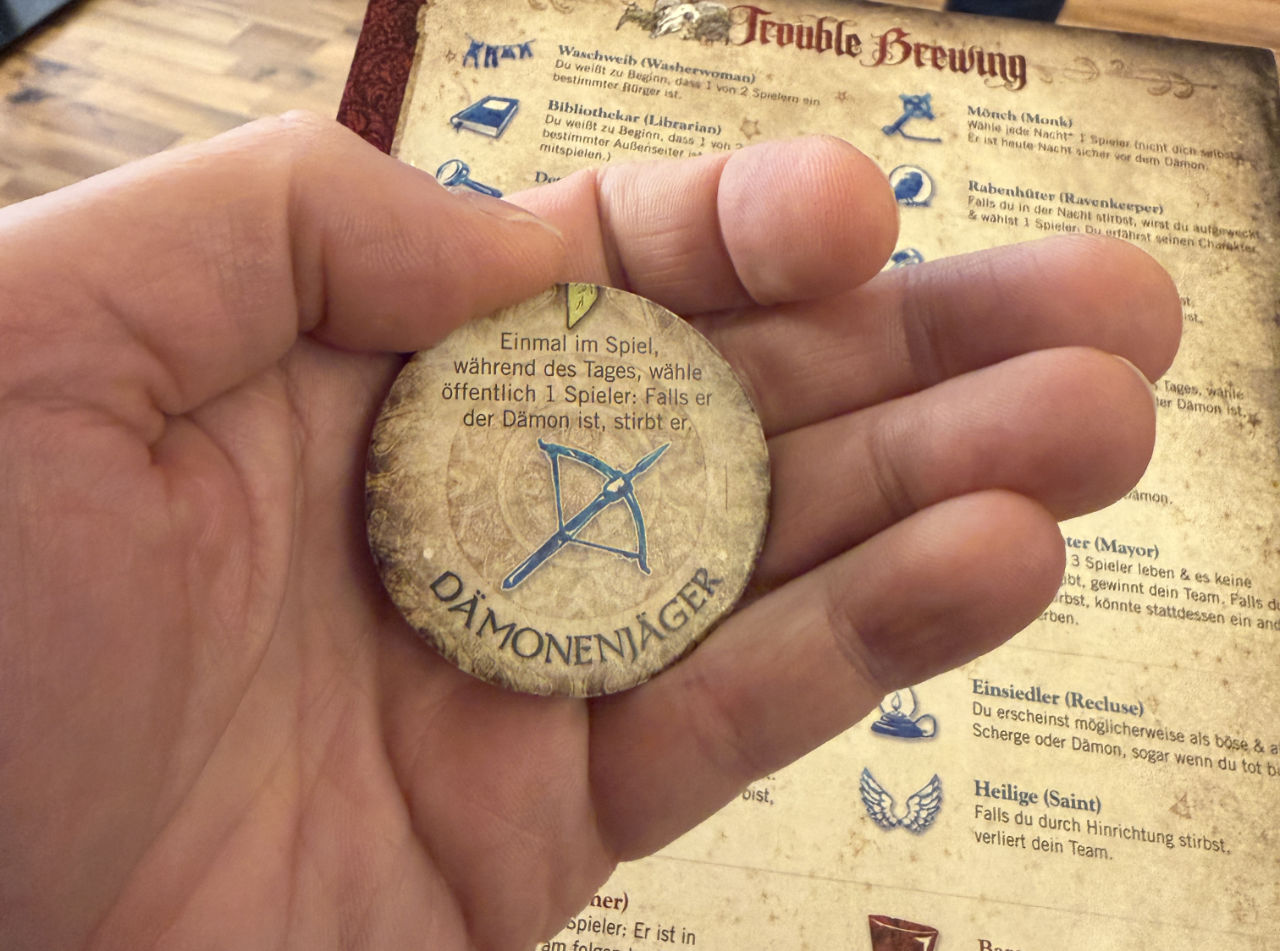 - So gibt es unzählige Rollen, keine ist doppelt. Bei den guten Rollen sind Bürger wie den Mönch, der für die Nacht einen Spieler vor dem Dämon schützen kann. Oder der Empath, der nachts erfährt, wieviele lebende direkte Nachbarn böse sind.