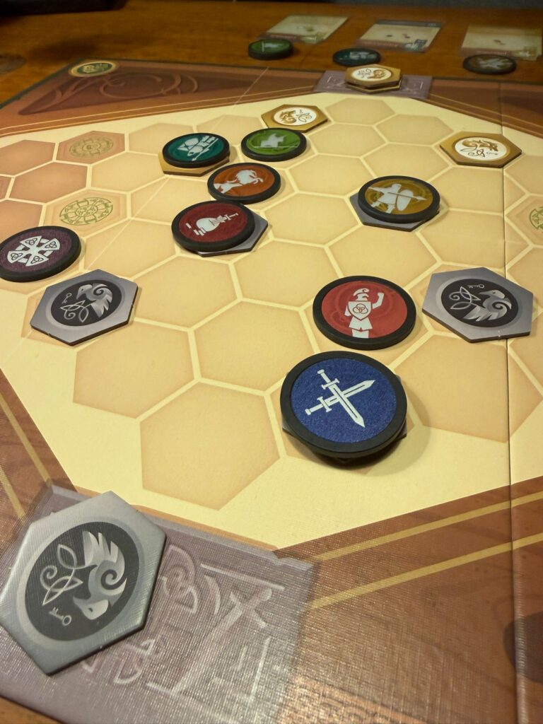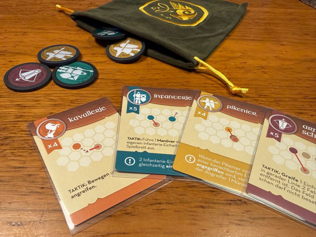 Jede Runde beginnt nun mit Ziehen von drei Chips aus unserem Beutel. Wir können die jeweiligen Truppen auf dem Board platzieren, bewegen, den Gegner angreifen oder die individuelle Taktik ausführen. Jede Einheit hat ihre Stärken mit dem Ziel am Ende Gebiete zu sichern, nicht unbedingt gegnerische Einheiten zu besiegen. Es gilt dabei den eigenen Beutel an Truppen durch das Drafting neuer Einheiten gut zu planen – denn nur mit einem ausgespielten Chip der gleichen Truppenart, kann man eine vorhandene Truppe auf dem Spielbrett ein Manöver ausführen lassen.