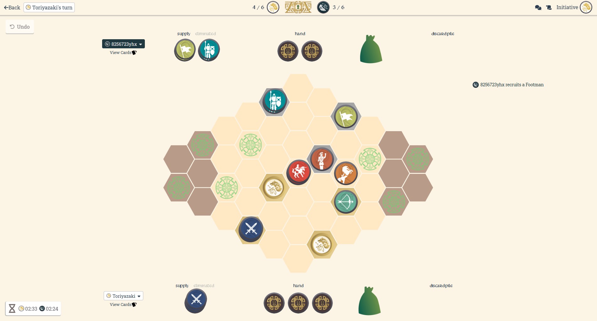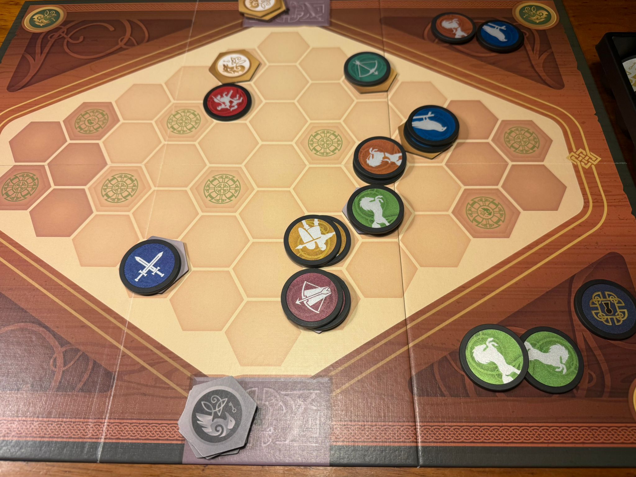 Jede Runde beginnt nun mit Ziehen von drei Chips aus unserem Beutel. Wir können die jeweiligen Truppen auf dem Board platzieren, bewegen, den Gegner angreifen oder die individuelle Taktik ausführen. Jede Einheit hat ihre Stärken mit dem Ziel am Ende Gebiete zu sichern, nicht unbedingt gegnerische Einheiten zu besiegen. Es gilt dabei den eigenen Beutel an Truppen durch das Drafting neuer Einheiten gut zu planen – denn nur mit einem ausgespielten Chip der gleichen Truppenart, kann man eine vorhandene Truppe auf dem Spielbrett ein Manöver ausführen lassen.