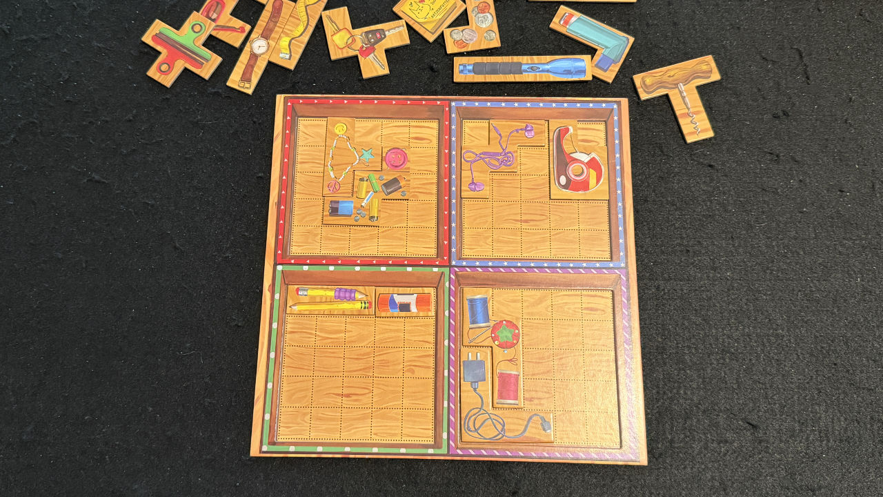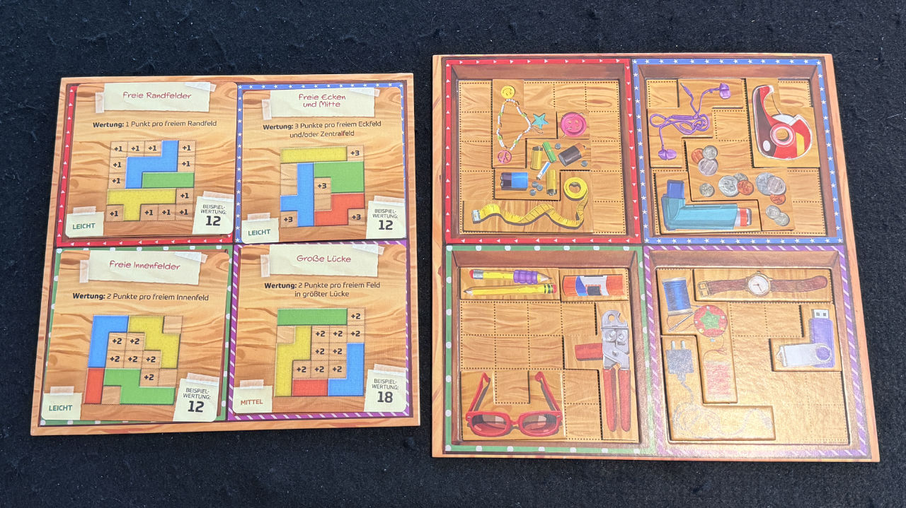 Und so wird für alle Spieler das erste Teil aufgedeckt und wir können noch planen, wie wir die Siegpunktebedingungen optimieren können. Denn in der einen Kiste gibt es Siegpunkte, wenn am Spielende die Ecken frei sind, woanders muss man den Rand frei haben oder ein großes zusammengehöriges Gebiet wird gewertet. Spätestens, wenn in der Runde das letzte Plättchen gezogen wird, und wir dieses in der verbliebenen Box einsortieren müssen, wird dieses nicht mehr so optimal in die Strategie passen.
