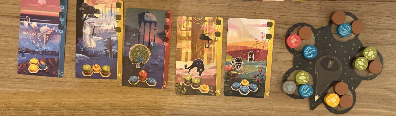 Harmonies war 2024 auf der Empfehlungsliste zum Spiel des Jahres und es ähnelt schon sehr dem Sieger Cascadia aus 2022. Harmonies ist aber doch weiterentwickelt und fluffiger. Insgesamt ist es auch klar besser als Cascadia. Das Material ist hochwertig, auch wenn die Tiere als kleine Würfel dargestellt werden. Vielleicht hab ich gerade zu viele Spiele dieser Art auf dem Tisch gehabt, daher wäre mir ein Alien-Szenario zu so einem Mechanismus lieber. Aber natürlich muss man Harmonies gespielt haben.