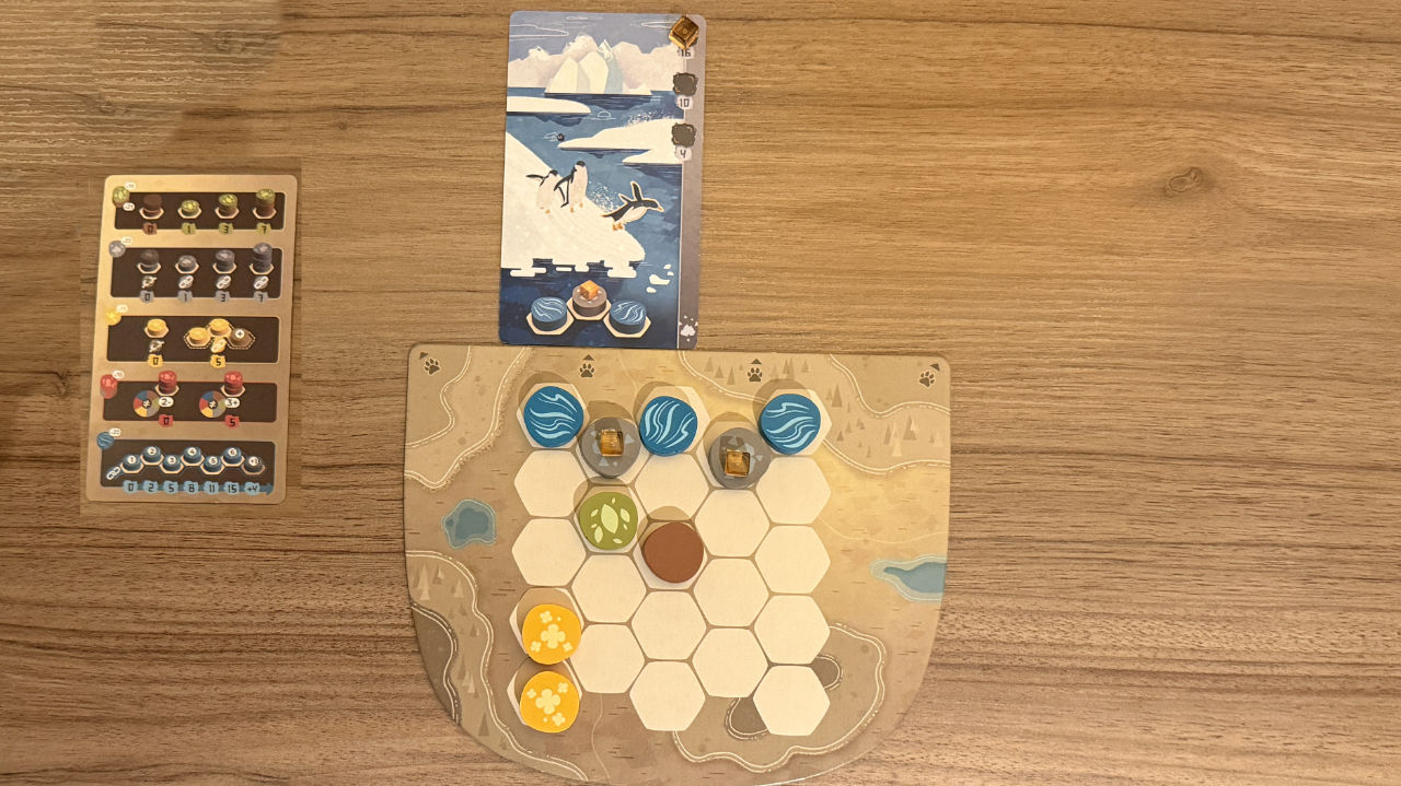 Der Grundmechanismus ist simpel. Wir wählen aus einer Auswahl von 5×3 Spielsteinen uns eine Dreiergruppe Landschaftsräume aus. Nun legen wir diese in unserem Tableau an, natürlich nach bestimmten Legeregeln. Optional dürfen wir danach noch eine Tierkarte aus der Auslage nehmen. Außerdem können wir in unserem Zug beliebig Tiere in unserer Landschaft entsprechend der Vorgaben der Tierkarten auslegen. Sind die Landschaftssteine alle, oder jemand hat weniger als drei freie Felder nach seinem Zug, endet das Spiel. Und das Punktezählen beginnt, jeder sucht seinen längsten Fluss, Berge nebeneinander, Bäume und kleine Feldergruppen.