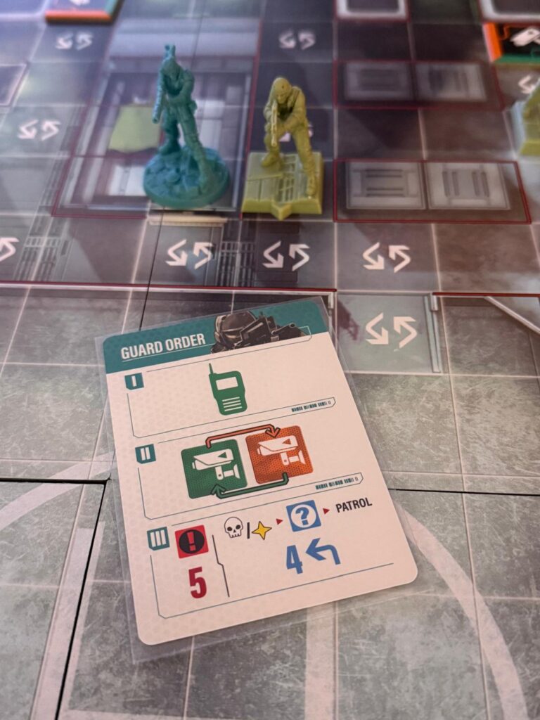 Die Kampagne startet direkt mit einem Metal Gear typischen Videocall und der ersten Mission, in der ich ungesehen einen Aufzug rufen und nehmen muss. Ich steuere Snake und kann meine vier Aktionspunkte beispielsweise auf Schleichen, schnelle Bewegung (kann ein Geräusch verursachen) oder einen stillen Takedown verwenden. Nach meinem Zug decke ich eine Aktionskarte für die Wachen auf, deren Bewegung ich danach abhandle.