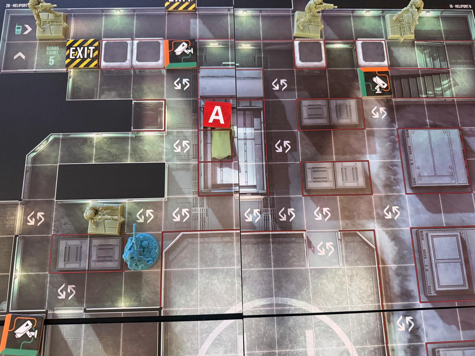 Die Kampagne startet direkt mit einem Metal Gear typischen Videocall und der ersten Mission, in der ich ungesehen einen Aufzug rufen und nehmen muss. Ich steuere Snake und kann meine vier Aktionspunkte beispielsweise auf Schleichen, schnelle Bewegung (kann ein Geräusch verursachen) oder einen stillen Takedown verwenden. Nach meinem Zug decke ich eine Aktionskarte für die Wachen auf, deren Bewegung ich danach abhandle.