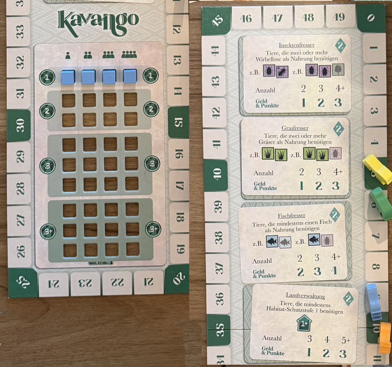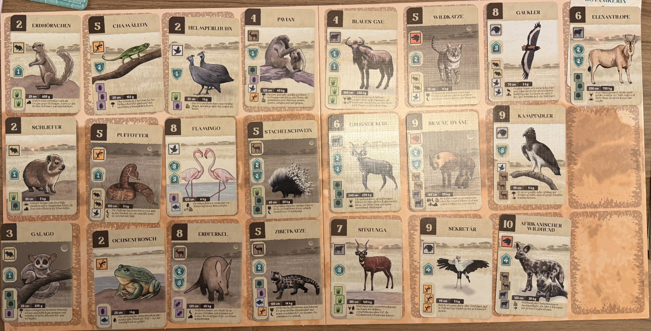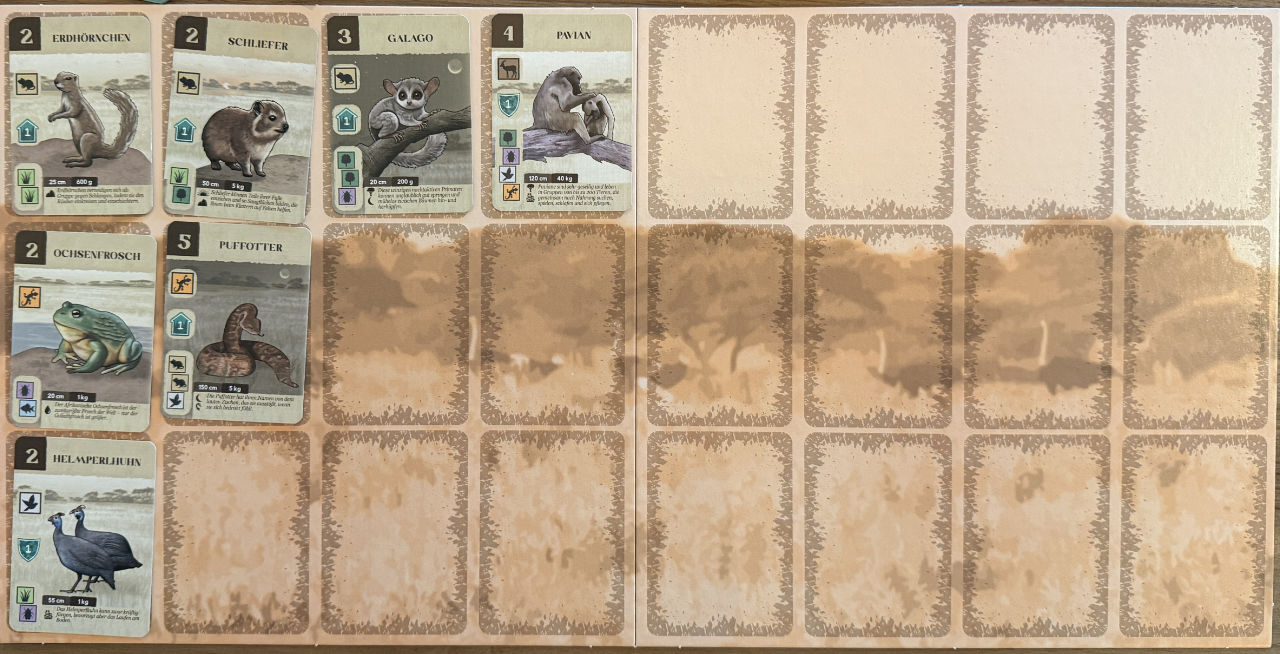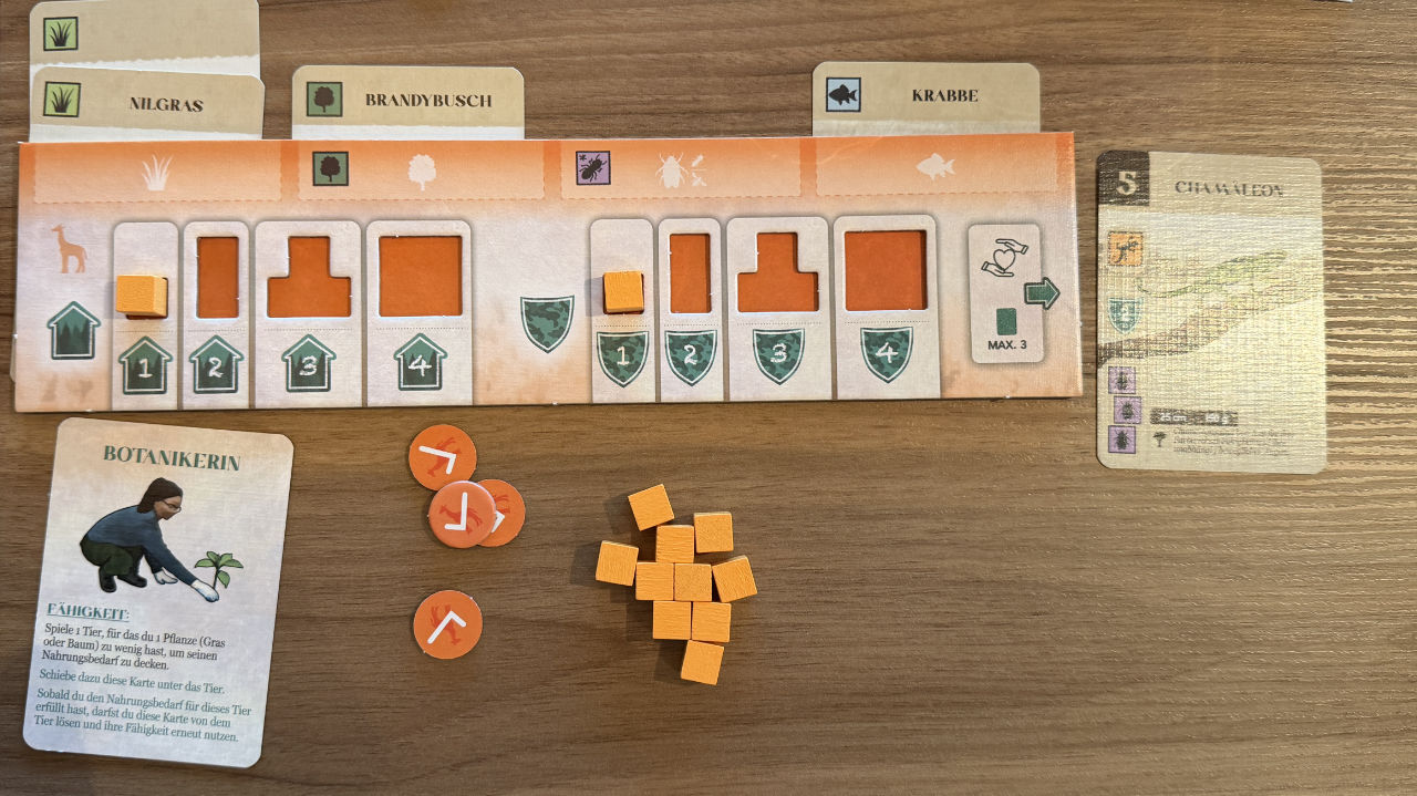 Das Spiel hat als Familienspiel einfache Mechanismen. Unsere Aufgabe ist ganz simpel: Sammle Siegpunkte. Hierzu haben wir ein Ressort aus 3×8 freien Plätzen und unser Tableau mit Habitat- und Wildtierschutz und das Kleintierfutter. Hinzu kommt ein gemeinsames Tableau für den Klimaschutz, auf dem auch die Siegpunkteleiste ist.