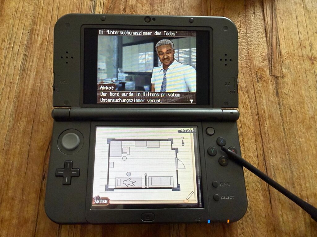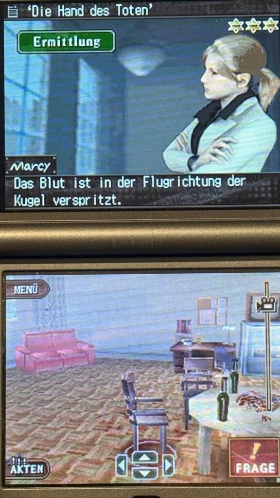 Es macht Spaß eine Szenerie abzusuchen und direkt zu erkennen, dass beispielsweise anhand des Winkels eines Schusses, der Mord von einer bestimmten Stelle passiert sein muss. Leider führt mich das Spiel erst später zu dieser Multiple-Choice Auswahl, so dass man sich wirklich sehr geduldig Schritt für Schritt der Lösung nähern muss. Meine Kollegin führt mich Schritt für Schritt durch die Fälle. Und sie redet auch ganz gern. Die nicht allzu ausufernden Texte werden wie bei Hotel Dusk Zeichen für Zeichen eingeklickert – und ja, sie sind nicht skipbar. Auch sonst ist es technisch nicht das beeindruckendste Nintendo DS Spiel, was etwas schade ist, da die erzählten Fälle an sich ganz spannend erdacht sind.