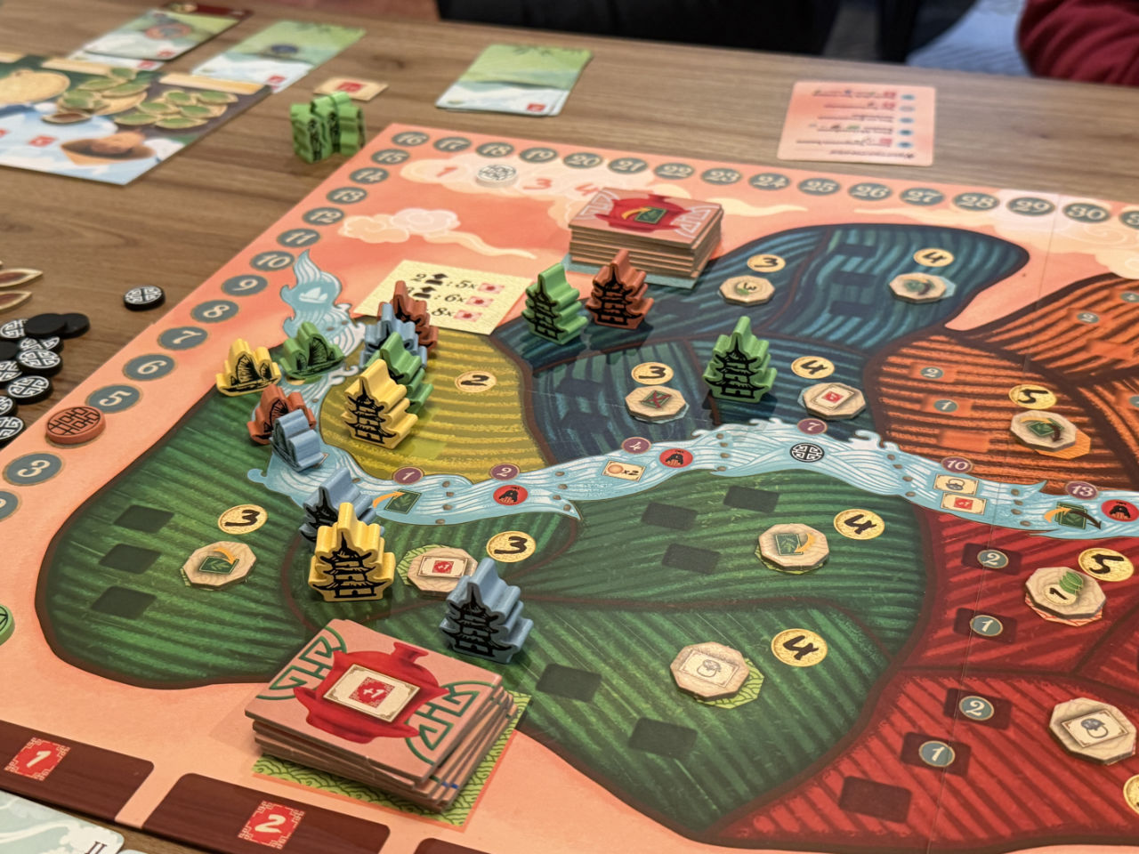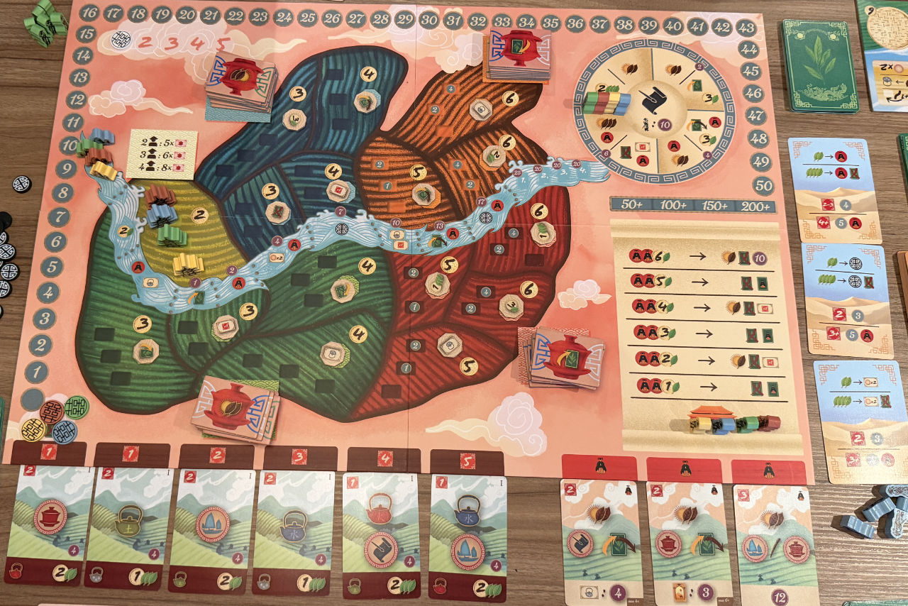 Ein Szenario mit Tee, entspannenden Farben und ein großes China mit dem Jangtse. Aber all dies soll nicht täuschen, denn dies ist kein Familienspiel. Tomáš Holek hat hier wieder ein komplexes Eurogame designt mit Deckbuildung, Arbeitereinsatz & Ressourcenmanagement. So langsam entwickelt er sich zu meinem Lieblingsdesigner, denn seine Spiele sind wunderschön und herausfordernd, aber nicht zu komplex. Der BGG-Empfehlung als 3-Personen-Spiel sollte man folgen, denn mit vier Personen wurde es dann schon etwas zäh zum Spielende.