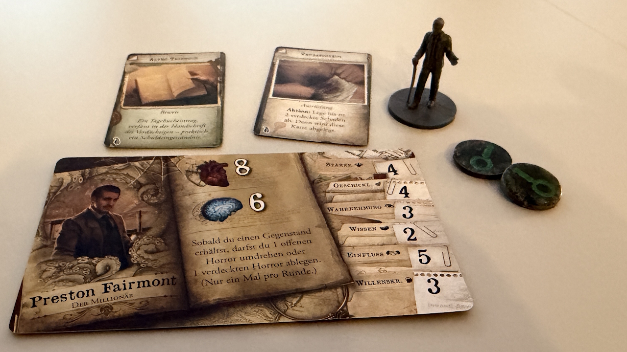 Bei dem Horror ist das ähnlich, nur werden wir beim ersten Mal, wenn wir soviel Horror erlitten haben, wie unsere geistige Gesundheit beträgt oder überschreitet, wird der Ermittler wahnsinnig. Auch hier gibt es eine Karte, die allerdings verdeckt gelesen werden muss, da sich hierdurch die Siegbedingungen dieses Ermitterls ändern können.