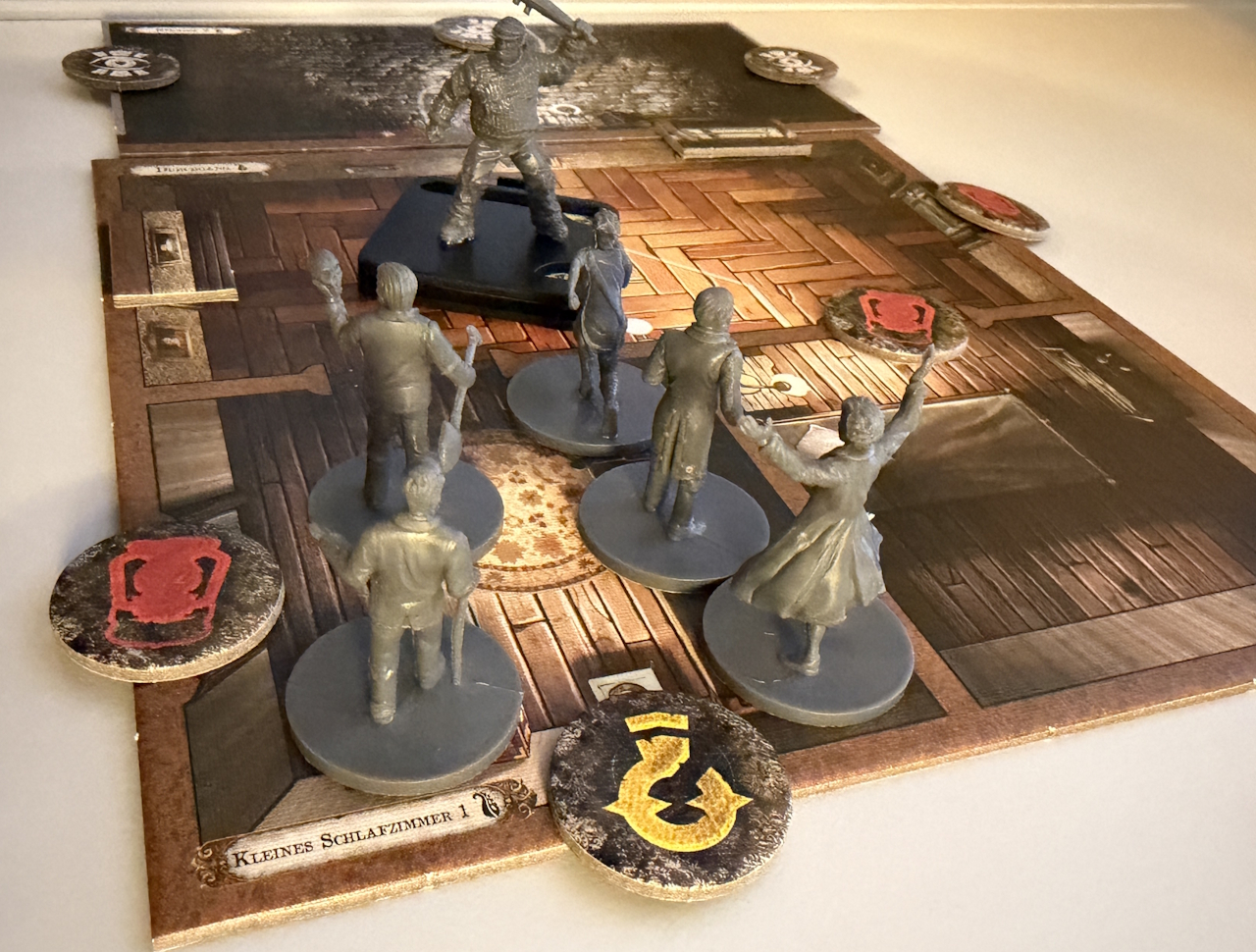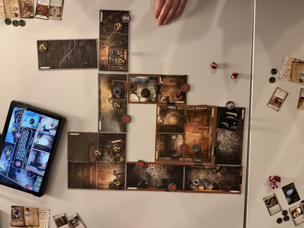 Nun beginnt der Aufbau mit dem ersten Spielplanteil. Durchsuchungs-, Erkundungs- und andere Marker werden gemäß der Anweisungen von der App gelegt und das Spiel beginnt.