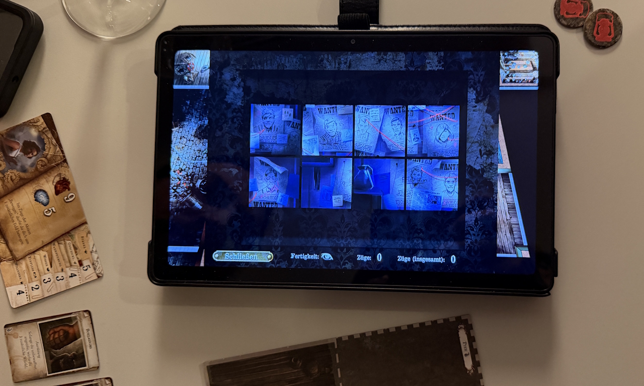 Manchmal müssen hier aber auch auf dem Tablet Zahlenrätsel geknackt oder Schiebepuzzel gelöst werden, bei denen jeder Ermittler, abhängig von den persönlichen Fähigkeitswerten, unterschiedlich viele Versuche bekommt. Beim Erkunden und öffnen einer Tür, kann dahinter ein Gegner zum Vorschein kommen, der mit einer weiteren Aktion angegriffen werden kann. Es können aber auch Personen auftauchen, die uns gerne freiwillig helfen oder dazu erst noch mit Charme überzeugt werden müssen.
