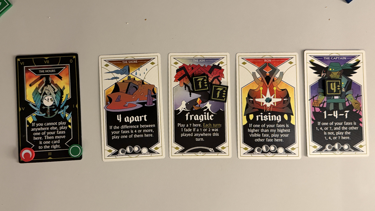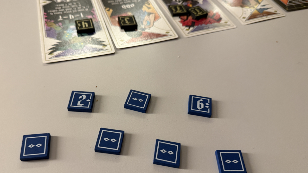 Ziel ist es, 7 korrekte Rätsel zu lösen. Hierzu ziehen wir zwei Plättchen mit Zahlen zwischen 1 und 7 aus einem Beutel und legen eine dann auf eine von vier vor uns ausliegenden Arcana-Karten. Hiermit geben wir einen Hinweis an die Mitspieler, welches zweites Zahlenplättchen wir bei uns liegen haben.