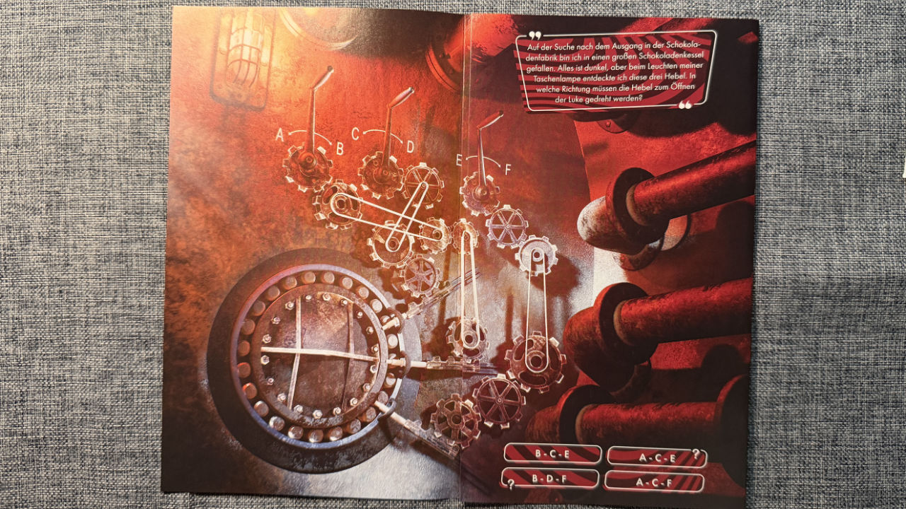 Die Idee ist zumindest schon einmal gut: Eine Packung Schokolade als Escape-Spiel. Als Story wurden wir nach einer Besichtigung der Fabrik zurückgelassen und müssen nun nachts aus der Fabrik entkommen. In fünf Puzzleabschnitten machen wir uns auf den Weg in die Freiheit und legen Logik-Schalter um oder suchen Hinweise in Bücherwänden. Und dabei essen wir mittelmäßige Schokolade.