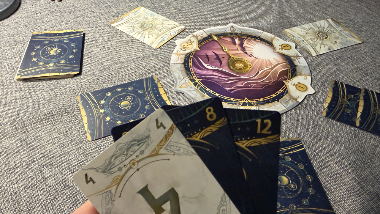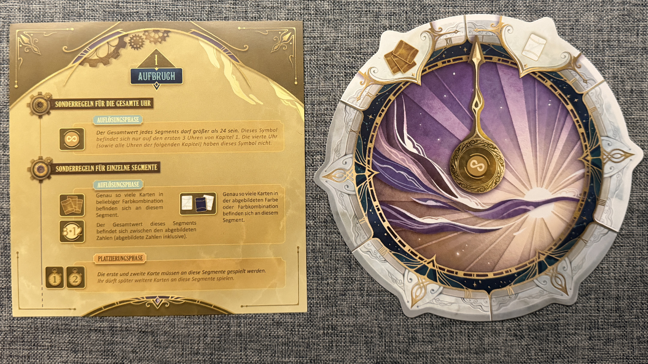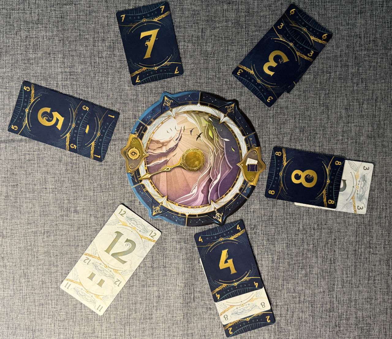 Das Spiel besteht aus je 12 hellen und dunklen Karten von 1 bis 12. Diese werden gemischt und kooperativ legen wird dann insgesamt 12 Karten abwechselnd verdeckt auf die 6 Plätze der Uhr. Dabei müssen wir bestimmte Legeregeln einhalten. So darf an bestimmten Feldern nur eine Karte oder nur helle Karten liegen, man muss an einem Feld die erste oder letzte Karte platzieren und vieles mehr. Wenn wir das Rätsel auflösen, muss auch noch die Summe der Zahlen auf den Karten aufsteigend sein und es darf höhere Summe als 24 geben.
