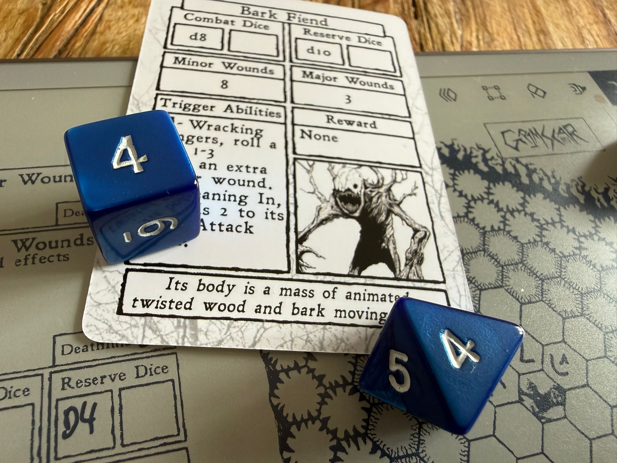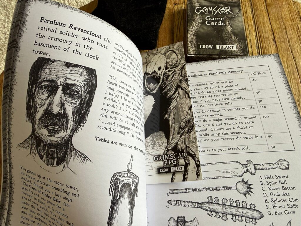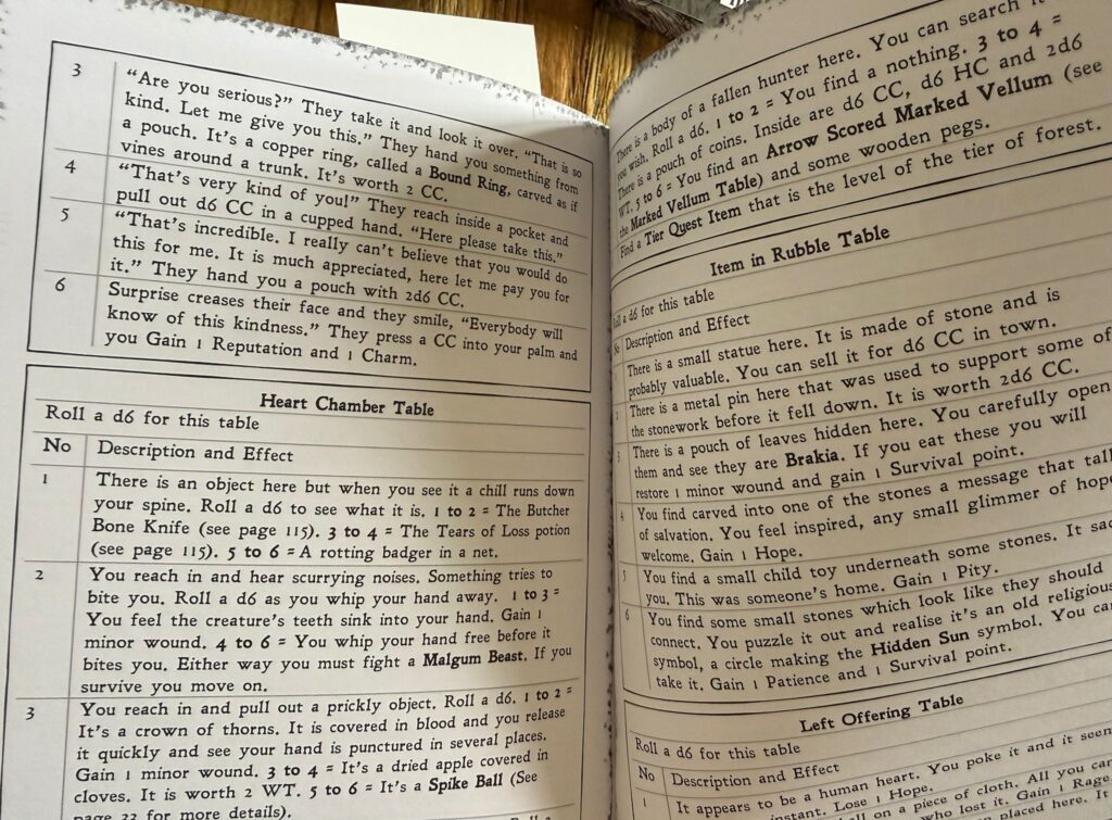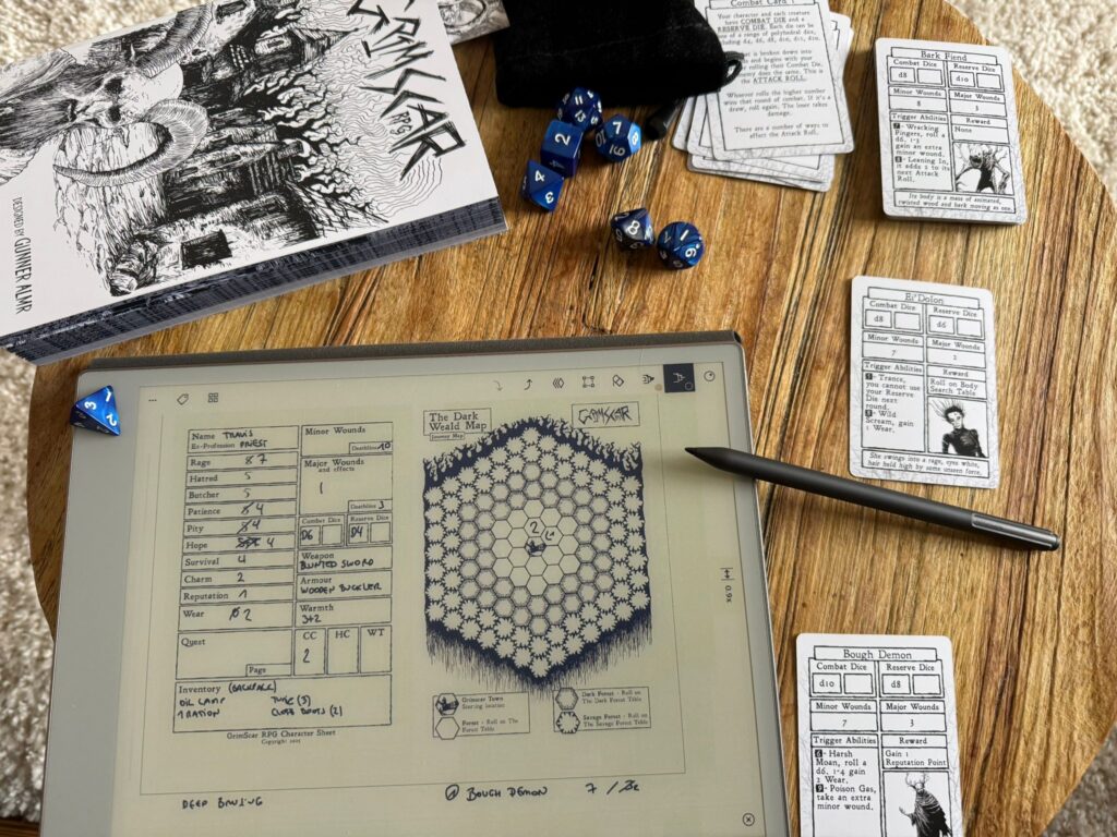 Und je länger ich spiele, desto mehr sinkt dazu mein Wert der „Hoffnung“ während meine Erschöpfung steigt. Anspannung, Unsicherheit und eine drückende Atmosphäre sind in Grimscar permanent präsent. Und wie viele Solo RPGs ist Grimscar nicht wirklich einfach – letztendlich ein Mittel, um daraus eine zusätzliche Spannung oder Anspannung zu ziehen.
