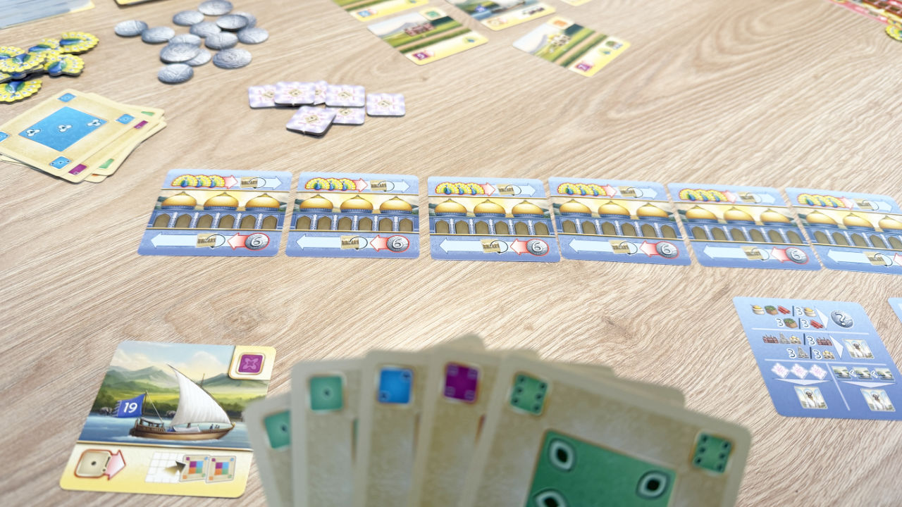 Ich mag Spiele, in den man ein paar Züge im Voraus planen kann. Und so sehe ich in der Auslage eine für mich wichtige Karte, die ich bald kaufen kann. Eigentlich kann sie auch niemand anderes wegkaufen, da sie sehr teuer ist. Doch man kann die Karte auch kostenlos umgedreht als Würfelressource auf die Hand nehmen, was dann auch jemand anderes macht. Und weg ist sie. Hier ist die multifunktionale Karte dann ein Nachteil für Strategen. Dadurch wird es etwas zufälliger, was im Hauptspiel so nicht der Fall ist.
