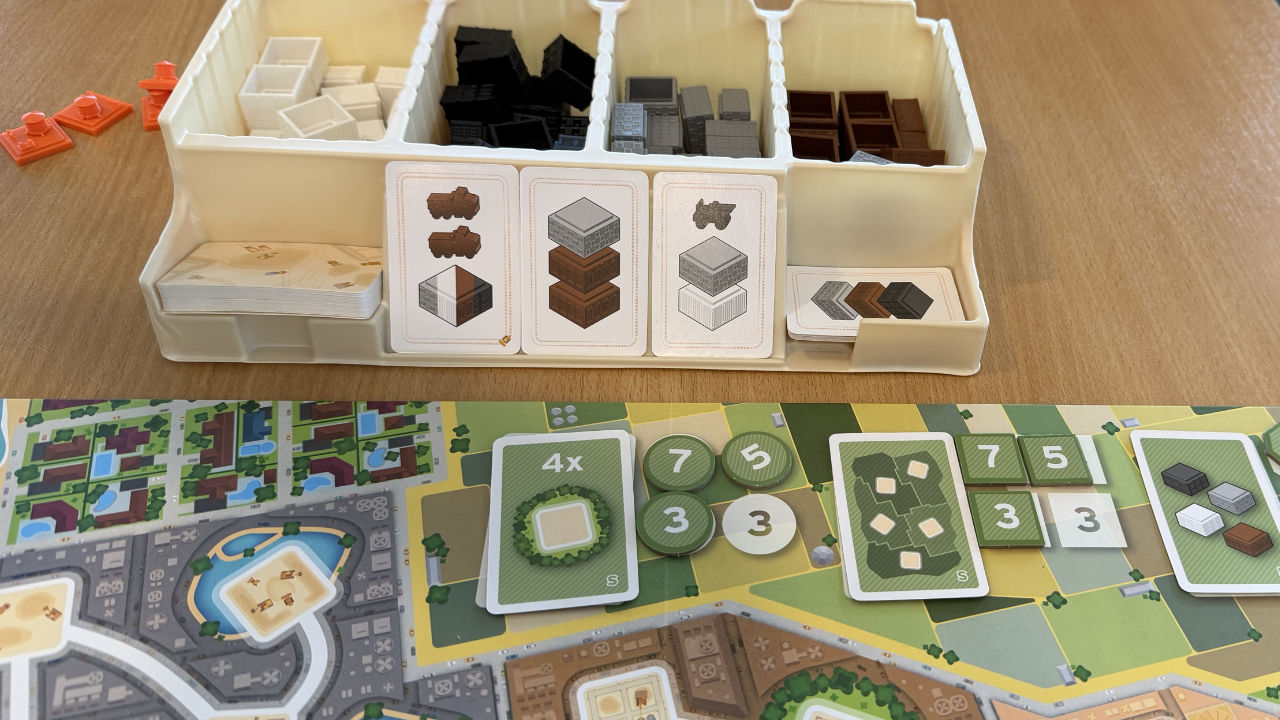 - eine Karte aus der 3er-Auslage wählen, um die entsprechenden Bauklötze in unseren Vorrat zu nehmen