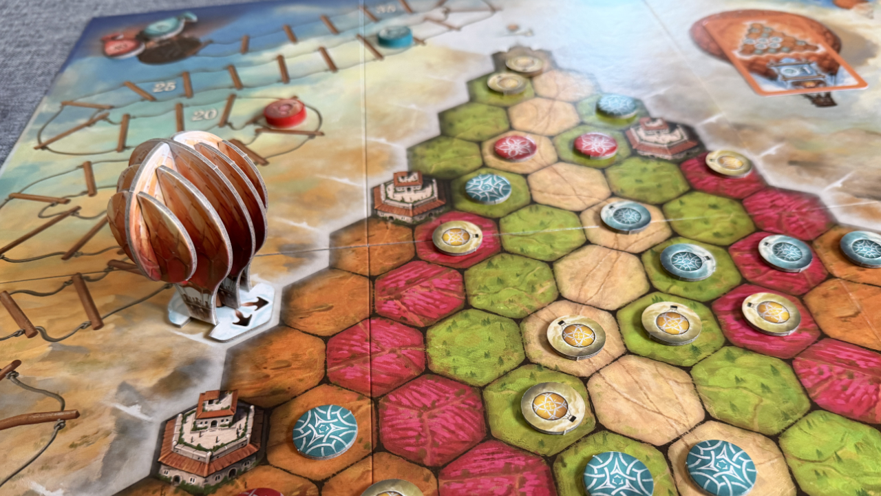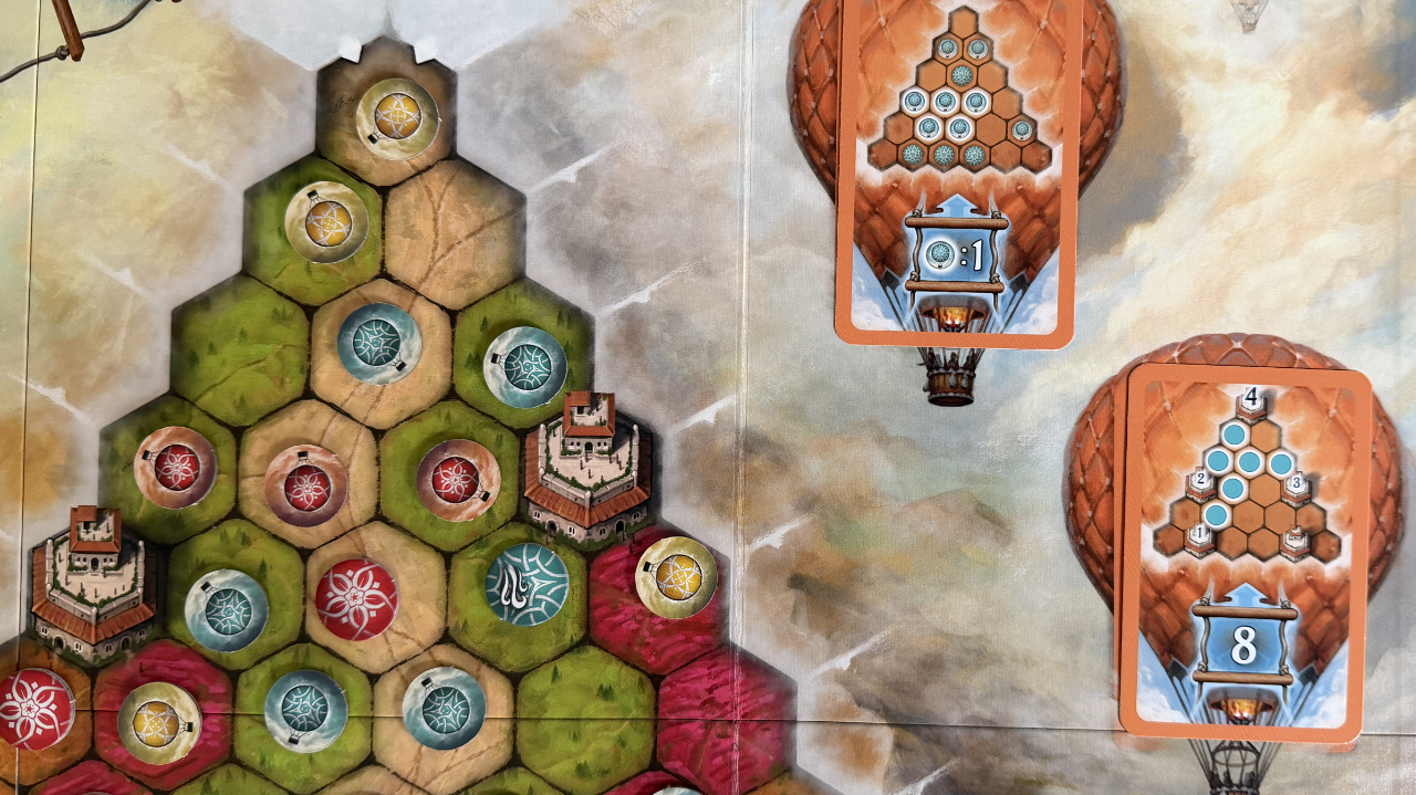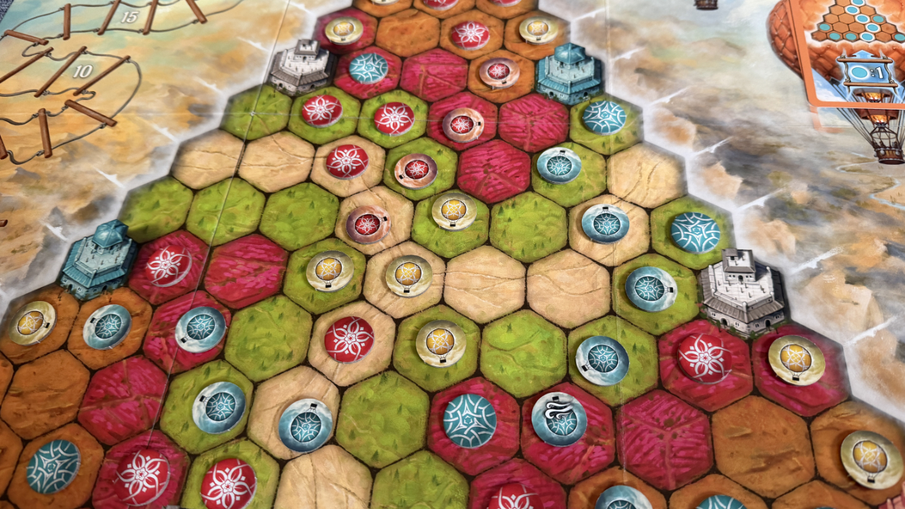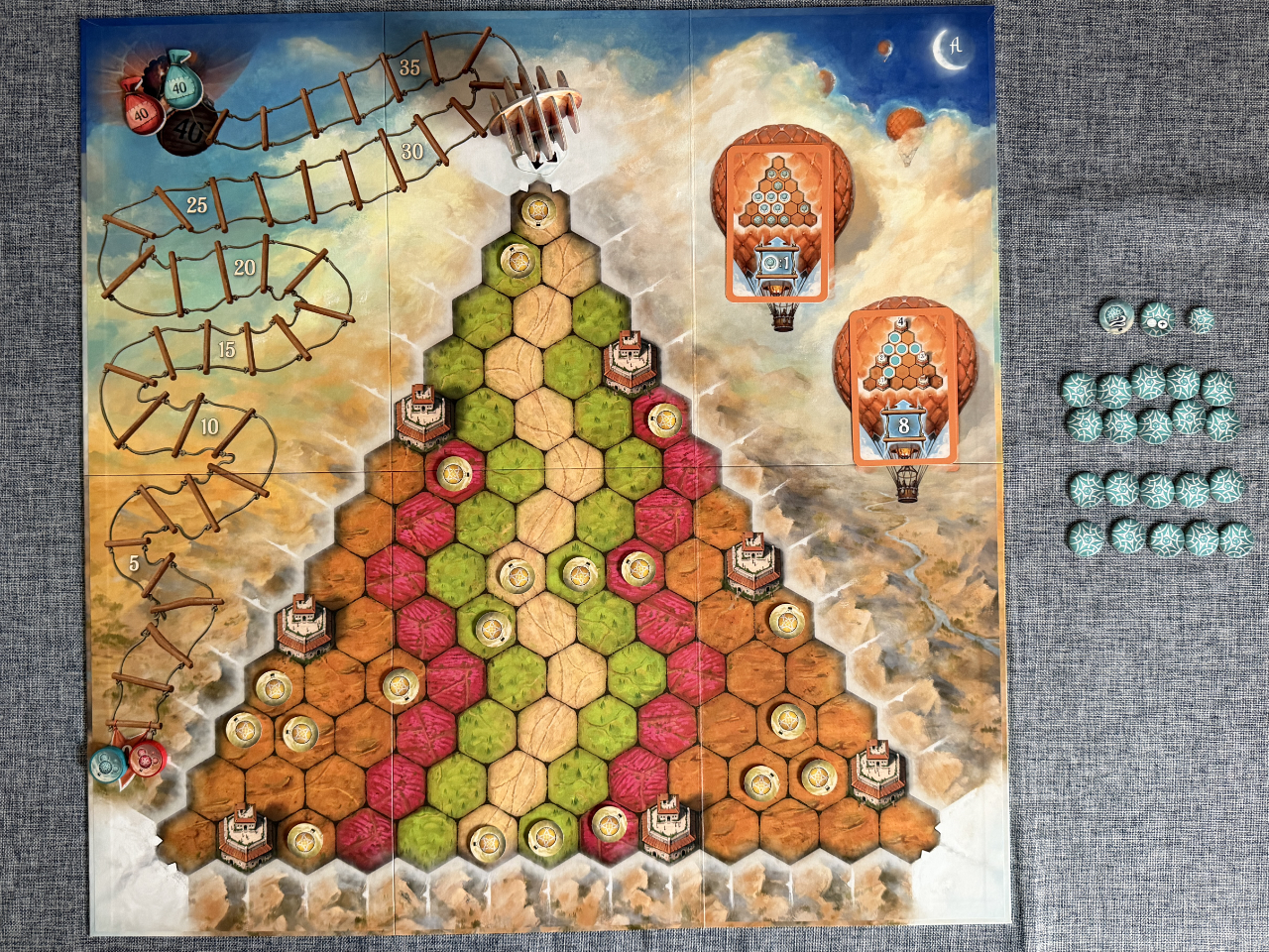 Ist man an der Reihe würfelt man, um den Heißluftballon weiterzuziehen und somit die beiden Geraden zu ermitteln, in denen man einen seiner eigenen Ballons platzieren kann. Habe ich eine ausreichende Anzahl benachbarter eigenen Ballons, kann ich